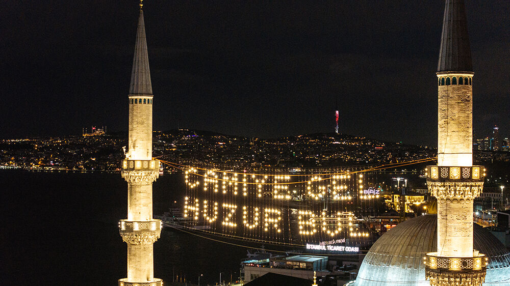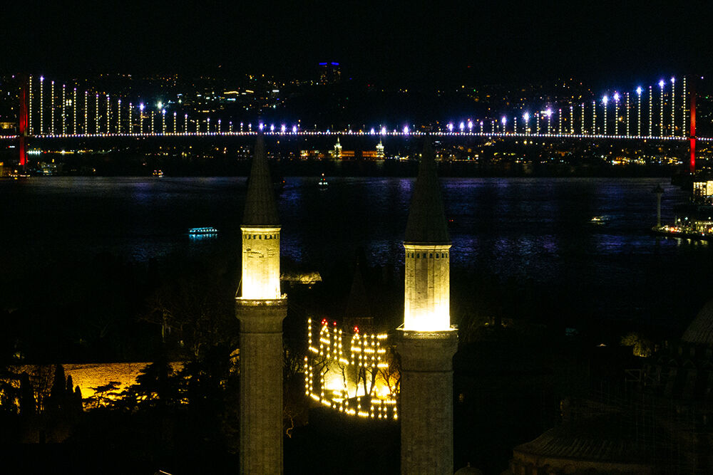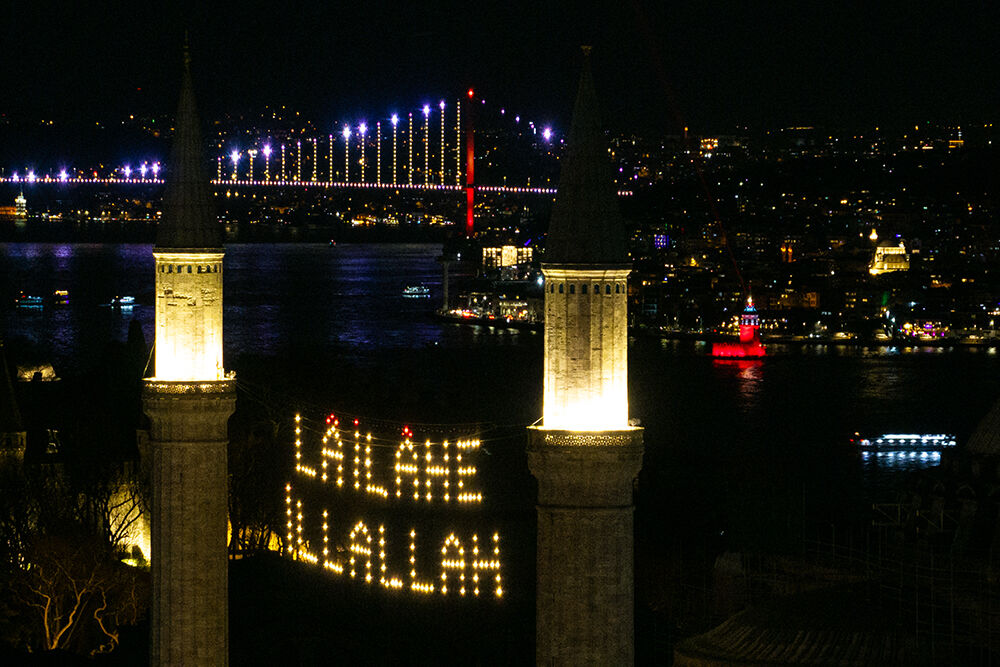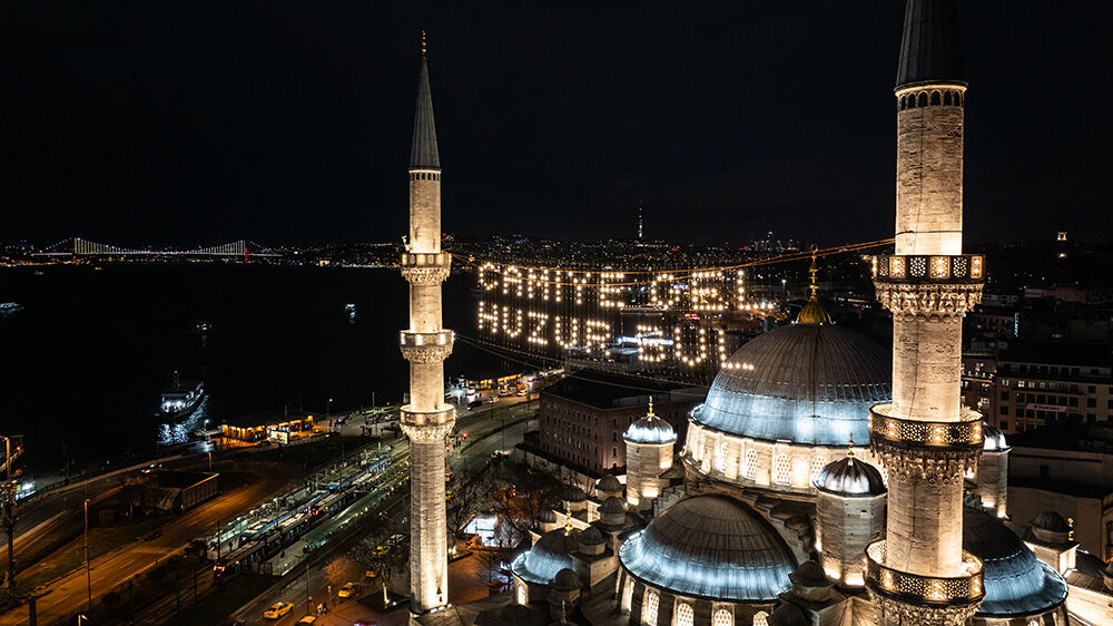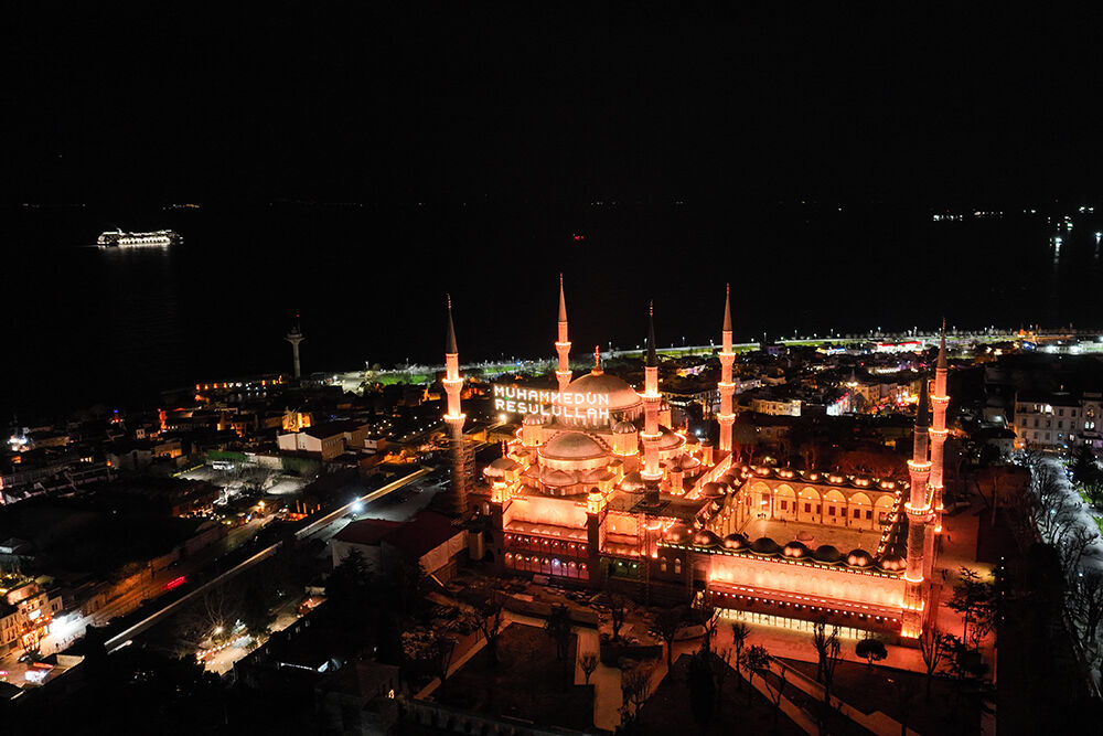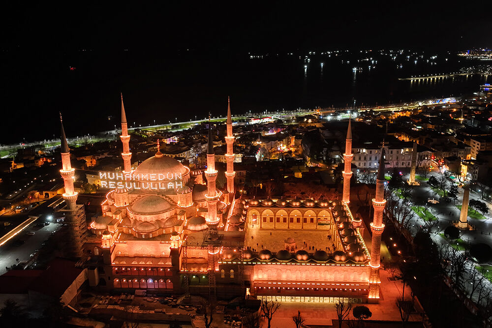 İstanbul’da ramazan ayı dolayısıyla minareleri arasına ‘’Muhammedün Resulullah’’ yazılı mahya asılan Sultanahmet Camii havadan görüntülendi.