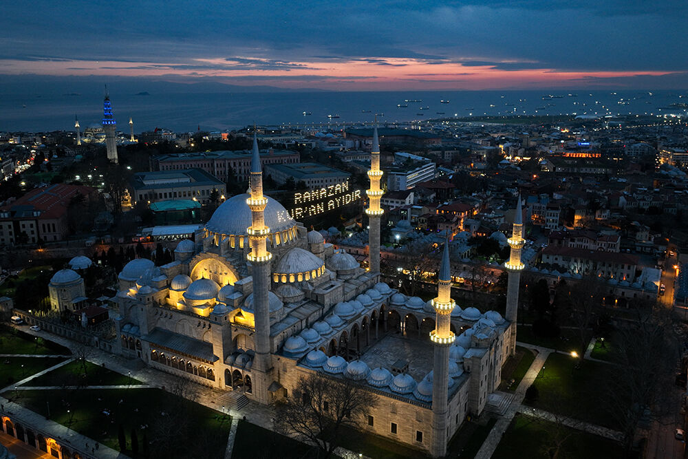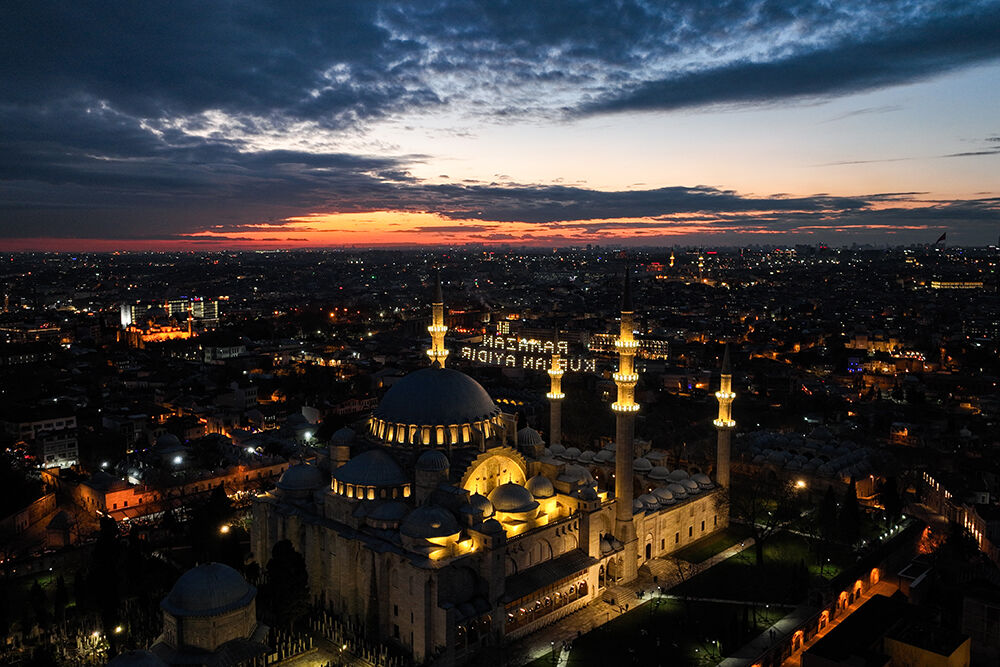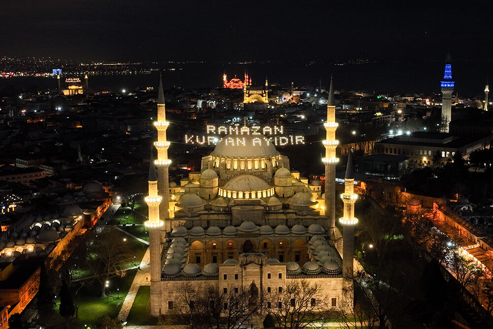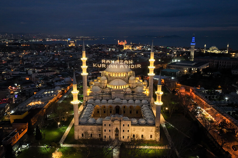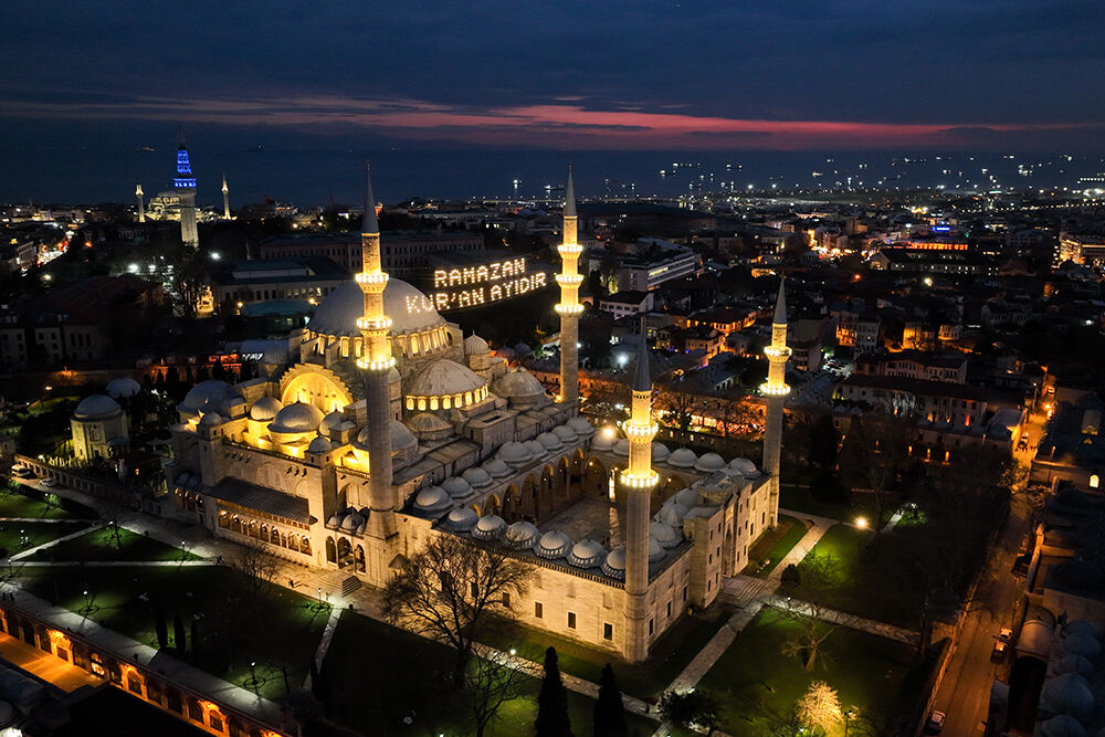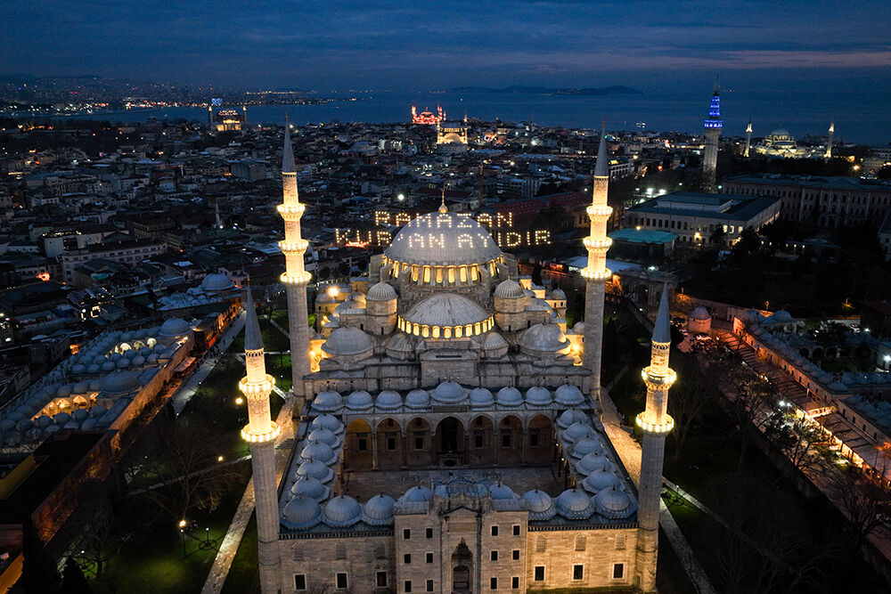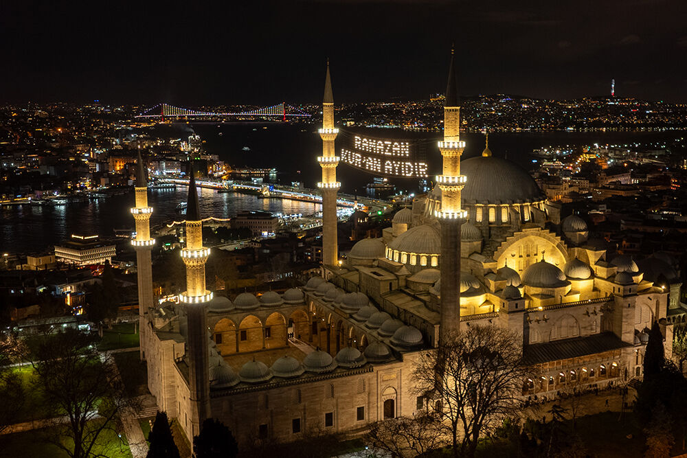 İstanbul’da ramazan ayı dolayısıyla minareleri arasına ‘’Ramazan Kur’an Ayıdır’’ yazılı mahya asılan Süleymaniye Camii havadan görüntülendi.