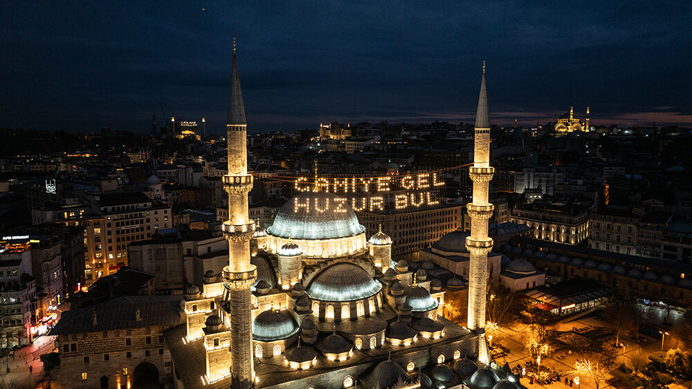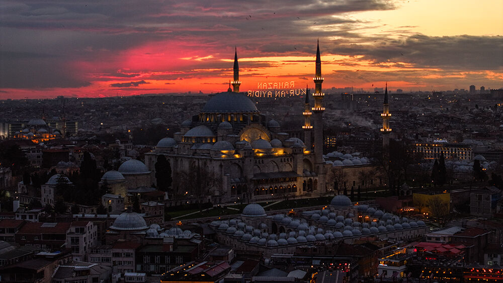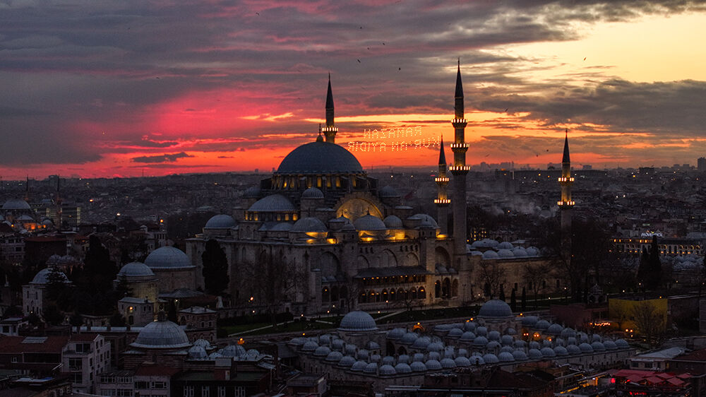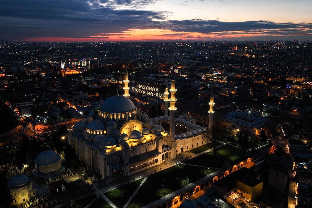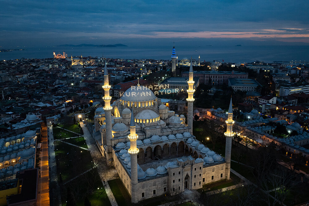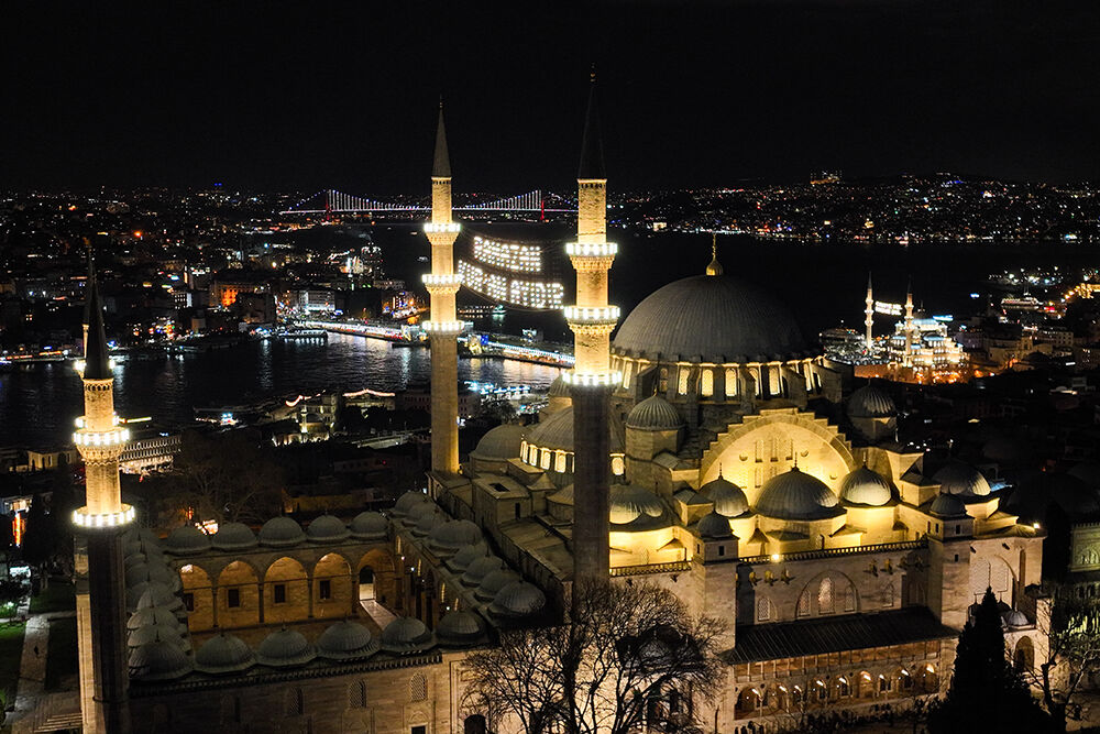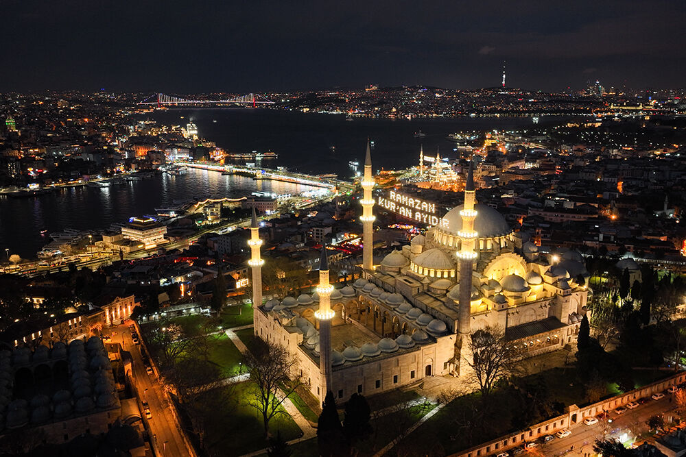 İstanbul’da ramazan ayı dolayısıyla minareleri arasına ‘’Ramazan Kur’an Ayıdır’’ yazılı mahya asılan Süleymaniye Camii havadan görüntülendi.
