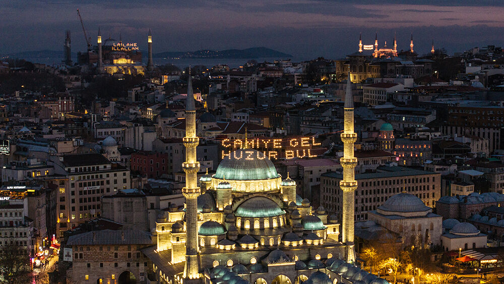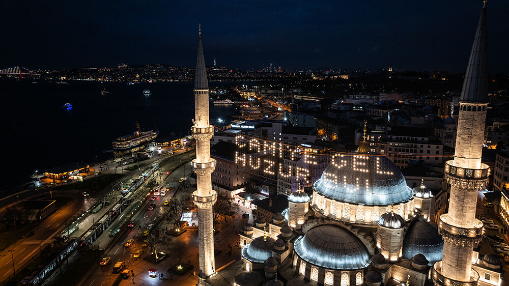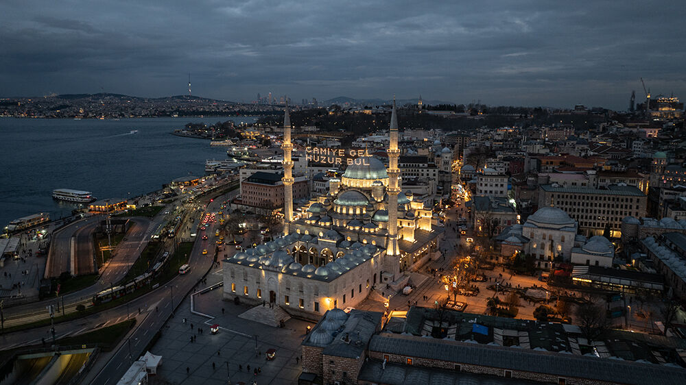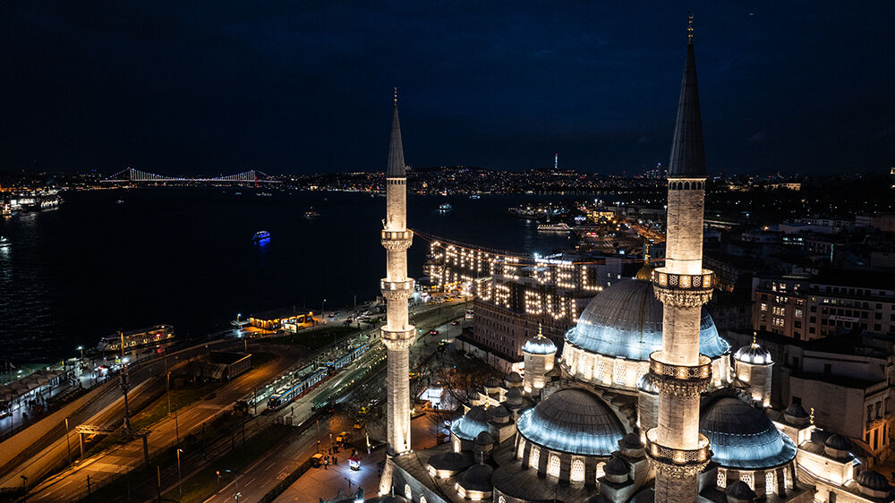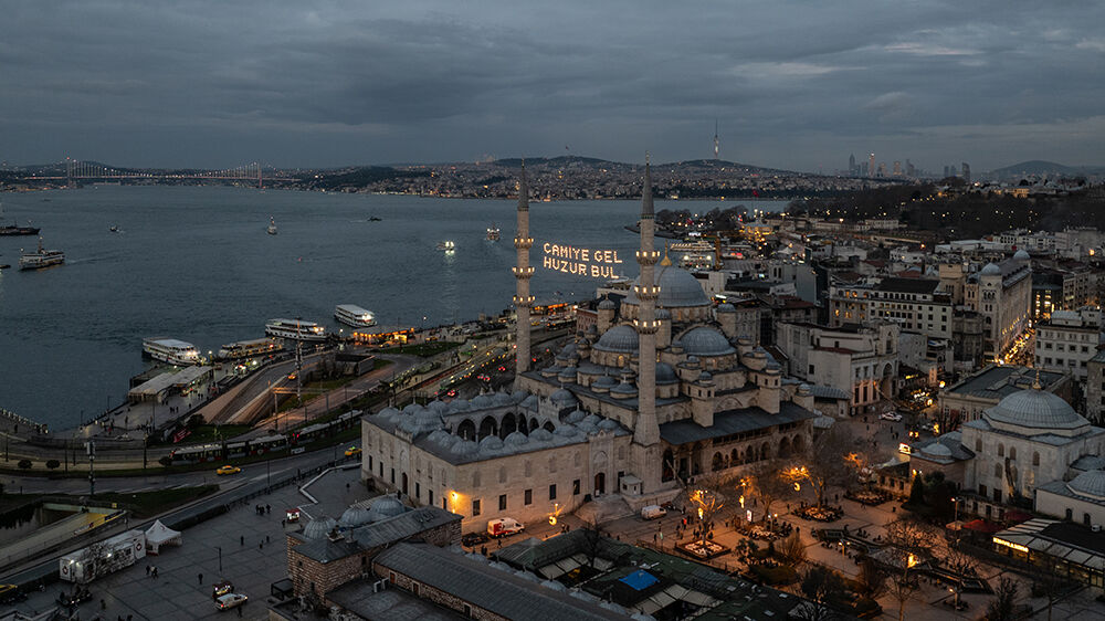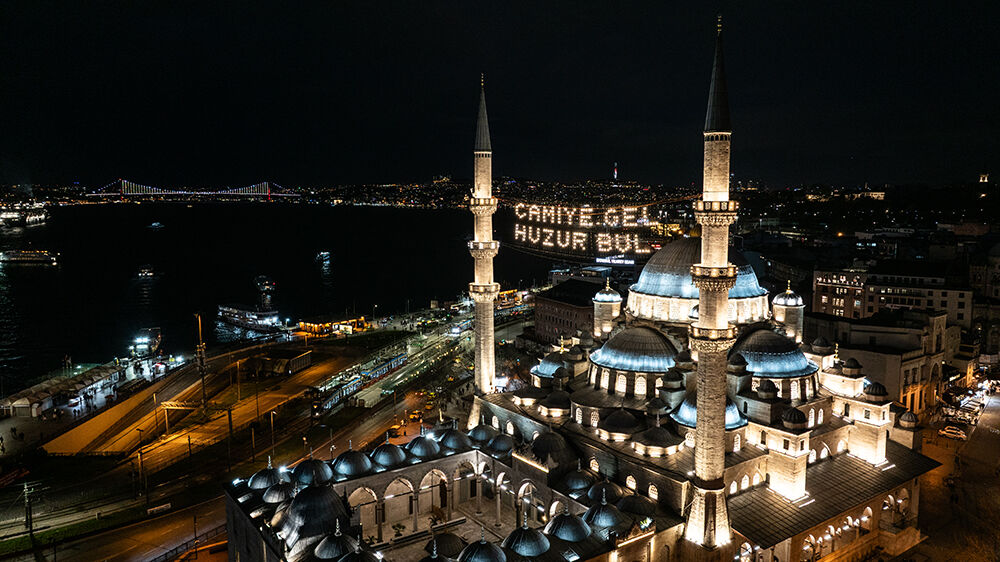 İstanbul’da ramazan ayı dolayısıyla minareleri arasına ‘’Camiye Gel Huzur Bul’’ yazılı mahya asılan Eminönü’ndeki Yeni Cami havadan görüntülendi.