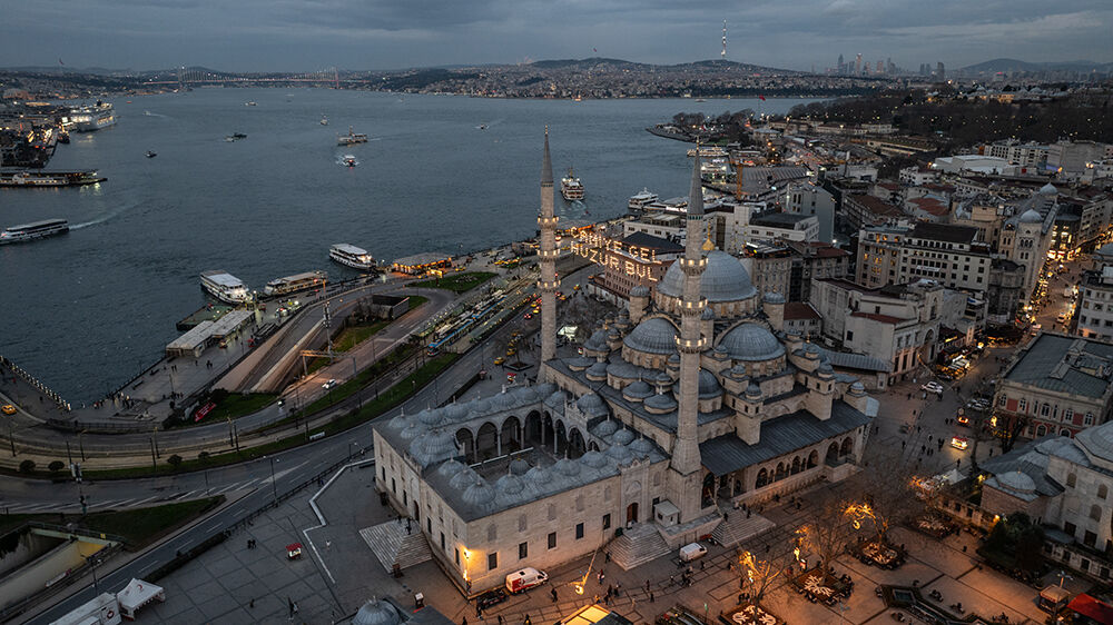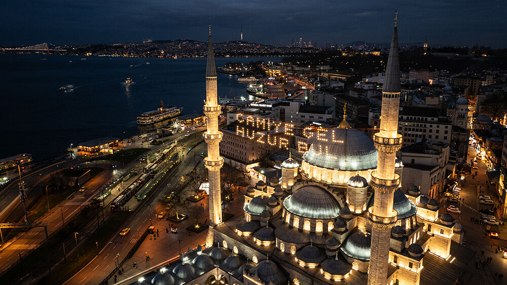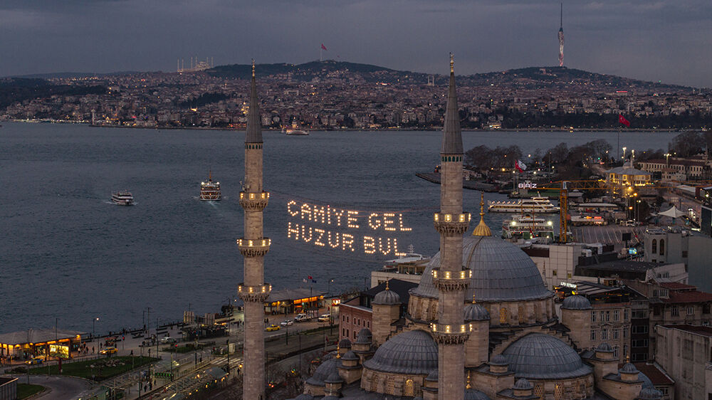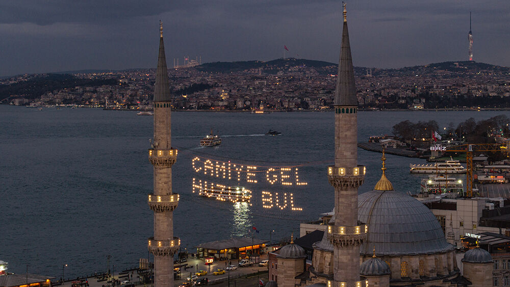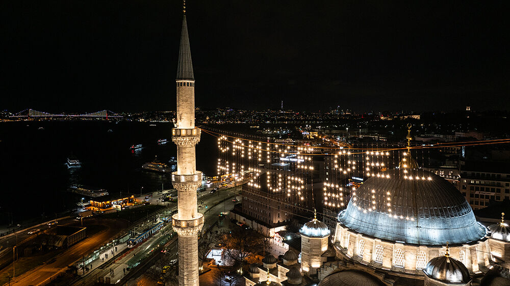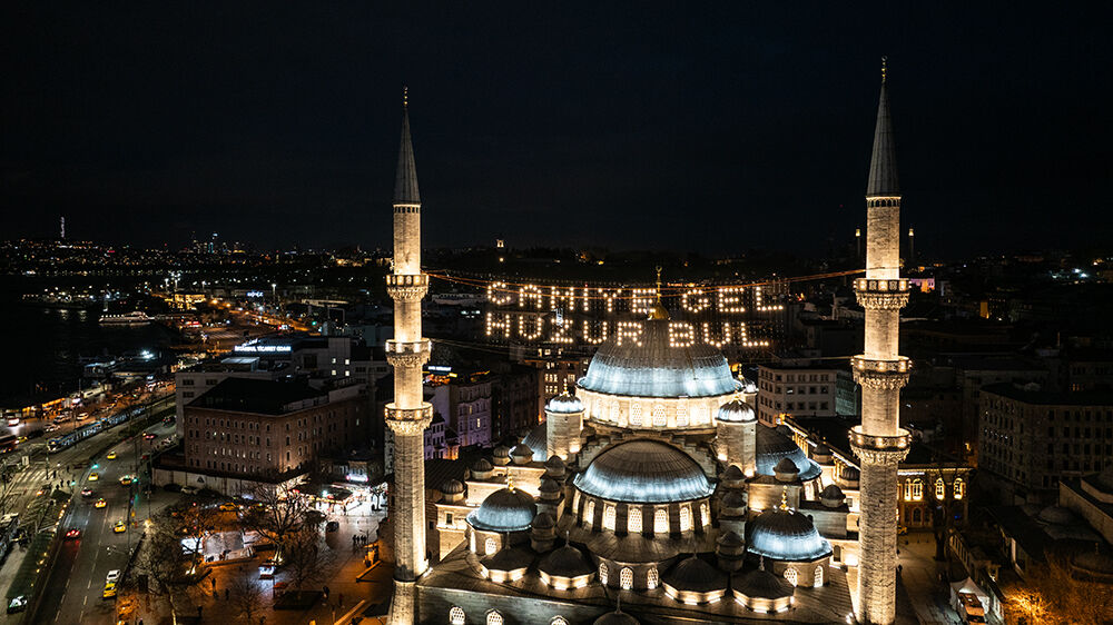 İstanbul’da ramazan ayı dolayısıyla minareleri arasına ‘’Camiye Gel Huzur Bul’’ yazılı mahya asılan Eminönü’ndeki Yeni Cami havadan görüntülendi.