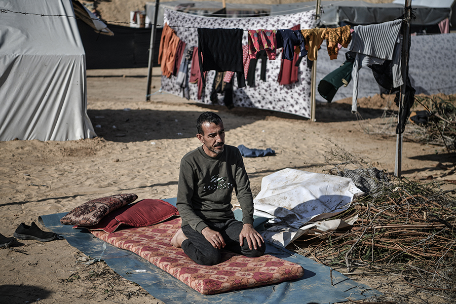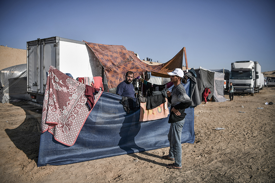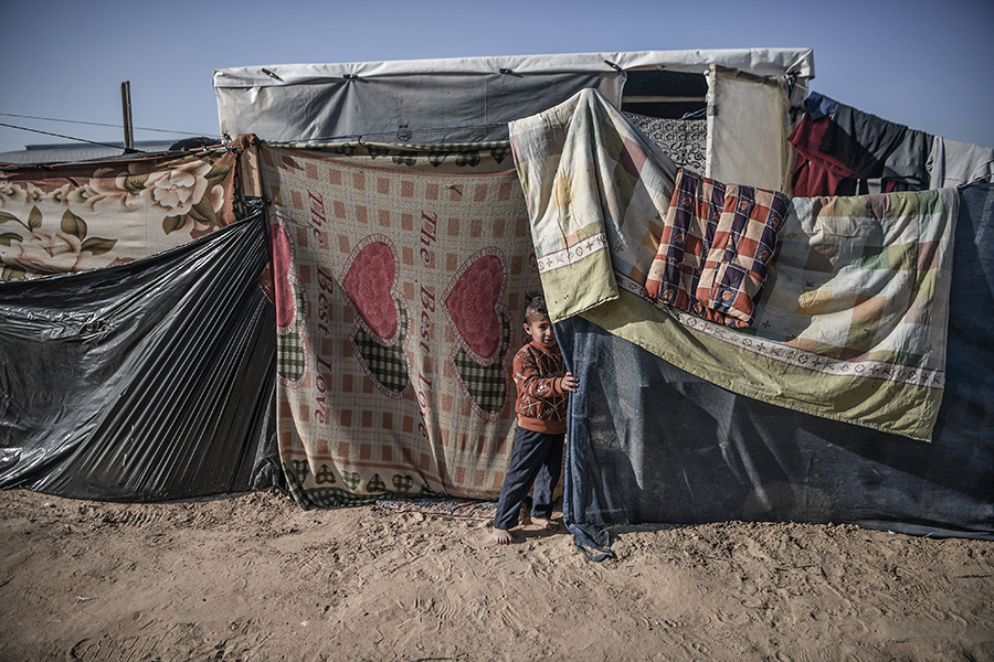 Katil İsrail'in bombardımanından korunmak ve can güvenliklerini sağlayabilmek için evlerini terk edip Refah kentine sığınan Filistinli aileler, boş arazide kurdukları derme çatma çadırlarda zor şartlar altında yaşamlarını sürdürmeye çalışıyor.