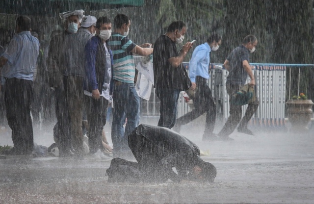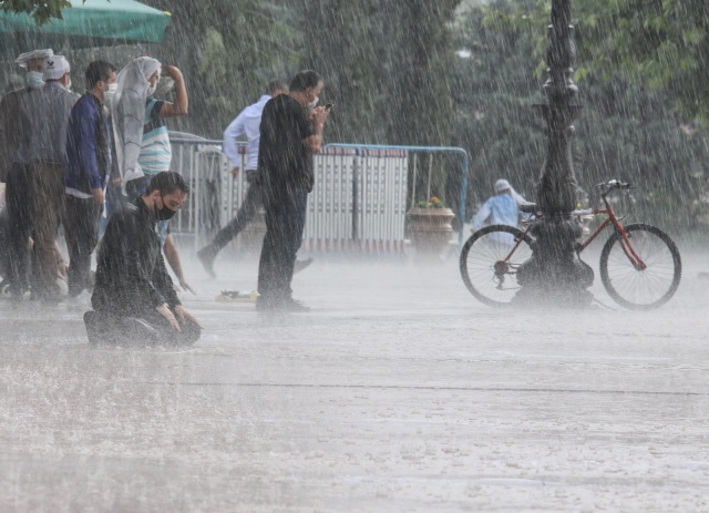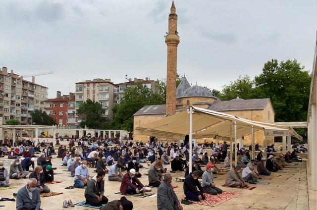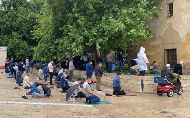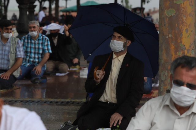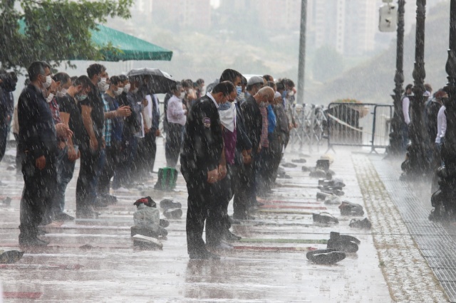 Açık havada namaz kılmak için gelen vatandaşlar, sosyal mesafeye uyarak yanlarında getirdikleri seccadeleri serip meydanda saf tuttu. Gece saatlerinden itibaren aralıklarla devam eden yağmur, namaz sırasında yeniden başladı.