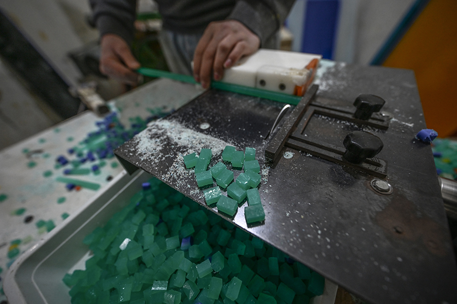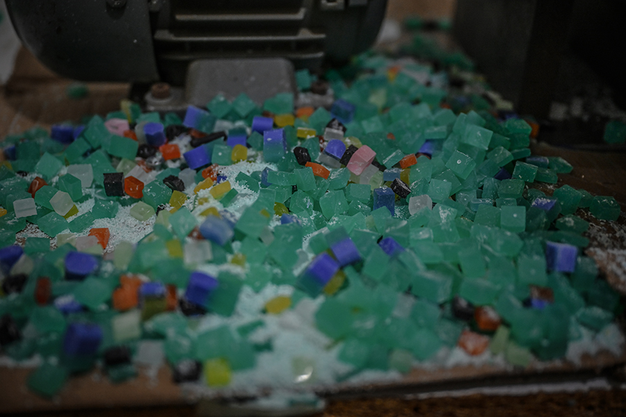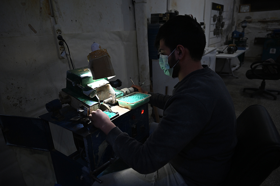 Kesilen parçalar parmaklar arasında tutularak dönen bir zımparada kendi eksenleri etrafında sürülerek silindir ve yuvarlak biçimlere dönüştürülüyor. Daha sonra tornanın aynasına sıkıştırılan bir çelik çubuk, eğe yardımıyla beş köşeli konik malafa şekline getiriliyor.