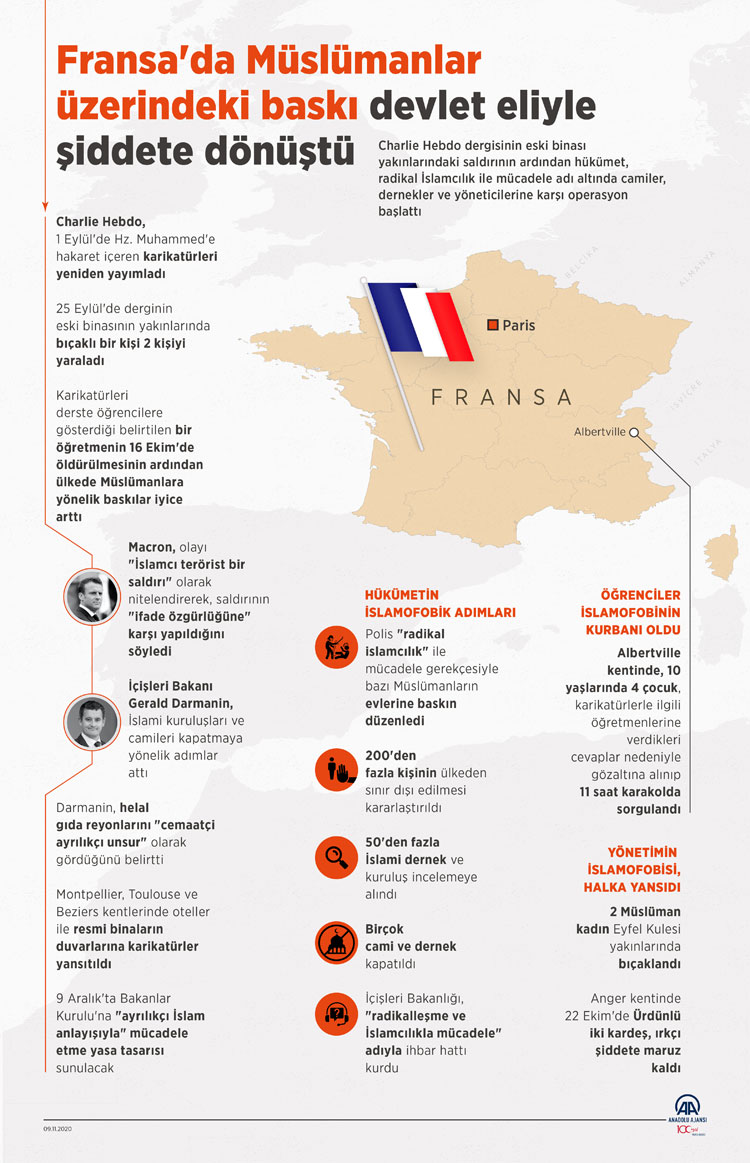 Tasarının 9 Aralık'ta Bakanlar Kurulu'na sunulacağını belirten Macron'un açıklamalarının ardından hükümet, "radikal İslamcılık ile mücadele" adı altında İslami ibadet yerleri, kuruluş ve yöneticilerine yönelik operasyonlar için düğmeye bastı.