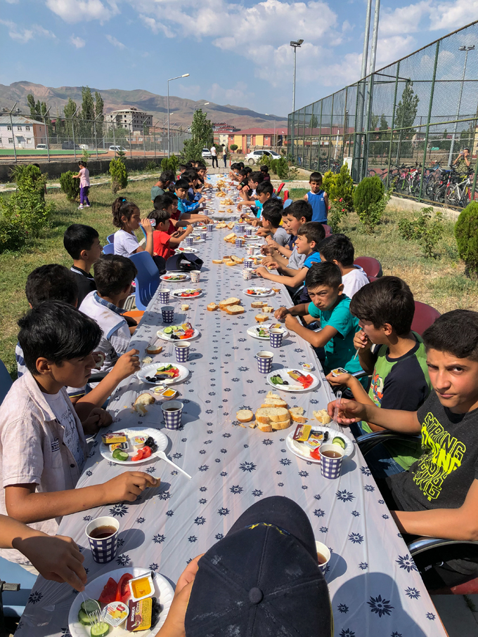 “İyiliğe” pedal çeviren gençleri, dönüş yolunda Doğubeyazıt Gençlik Merkezi’nde ikram edilen kahvaltı molasının ardından tekrar Ahmed-i Hani Camii’nin bahçesine geldi.