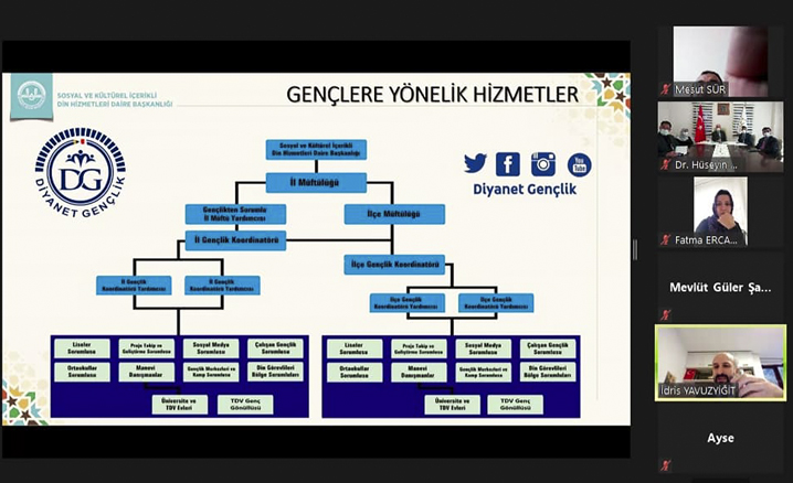 Koronavirüs tedbirleri kapsamında çevrimiçi düzenlenen seminerde; "Gençlerle Etkili İletişim Gençlere Ulaşma Stratejileri", "Dezavantajlı Gençlere Yönelik İletişim ve Problem Çözme Yöntemleri", "Diyanet İşleri Başkanlığı Gençlik Hizmetleri" konulu sunumlar gerçekleştirildi.