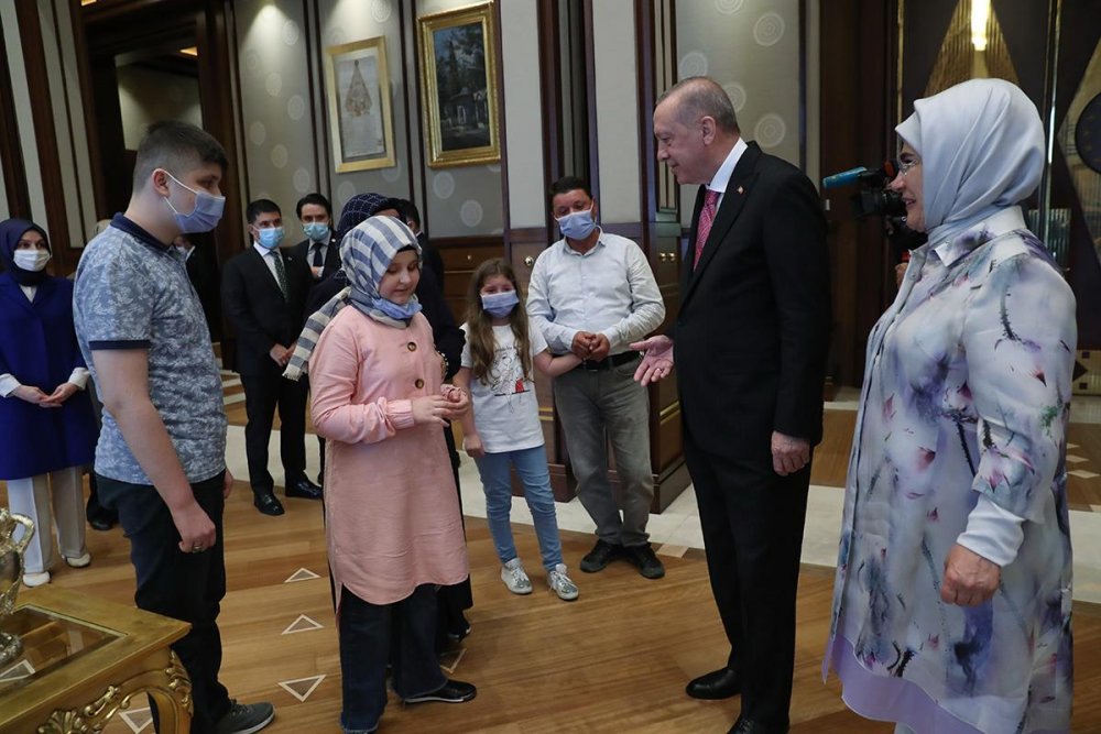 Cumhurbaşkanlığı Külliyesi'nde gerçekleşen kabulde, Cumhurbaşkanı Erdoğan'ın eşi Emine Erdoğan ve Diyanet İşleri Başkanı Prof. Dr. Ali Erbaş da hazır bulundu.