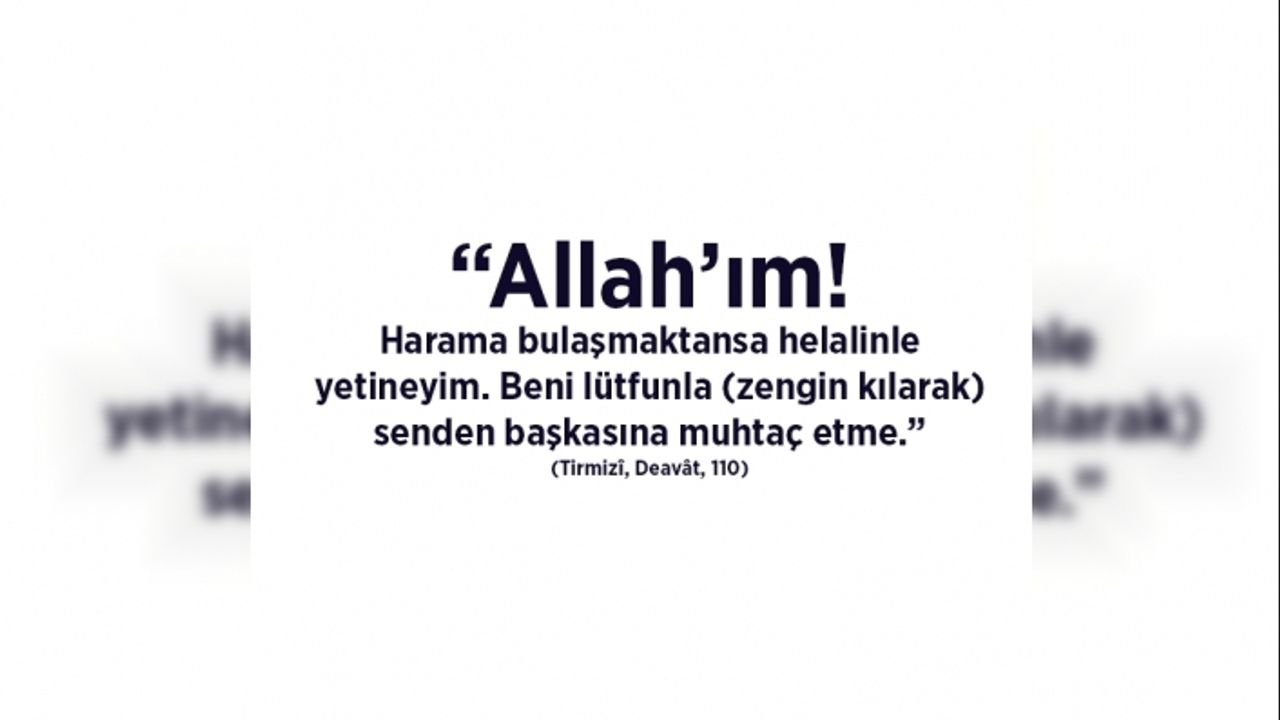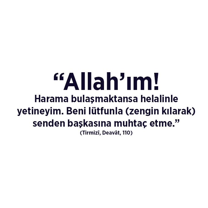 “Allah’ım! Harama bulaşmaktansa helalinle yetineyim. Beni lütfunla (zengin kılarak) senden başkasına muhtaç etme.” (Tirmizî, Deavât, 110)