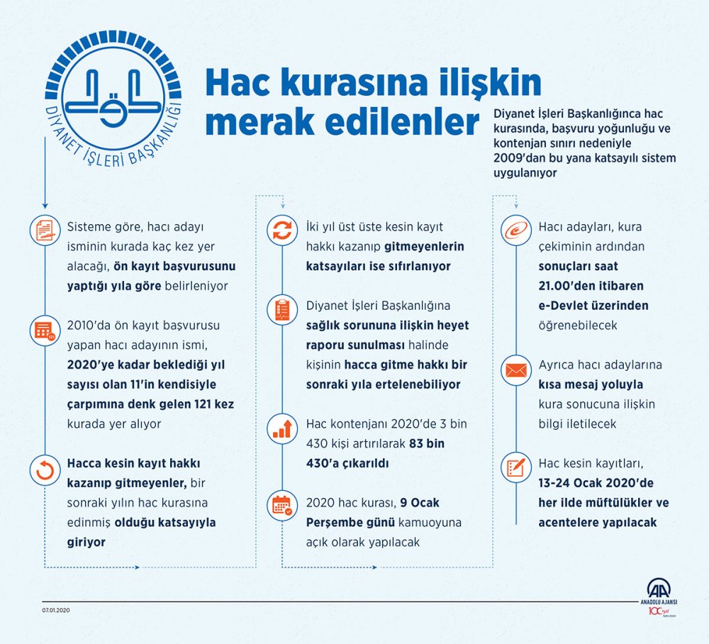 Hacı adayları, kura çekiminin ardından sonuçları saat 21.00'den itibaren e-Devlet üzerinden öğrenebilecek. Ayrıca hacı adaylarına kısa mesaj yoluyla kura sonucuna ilişkin bilgi iletilecek. Hac kesin kayıtları, 13-24 Ocak'ta müftülükler ve acentelere yapılacak.