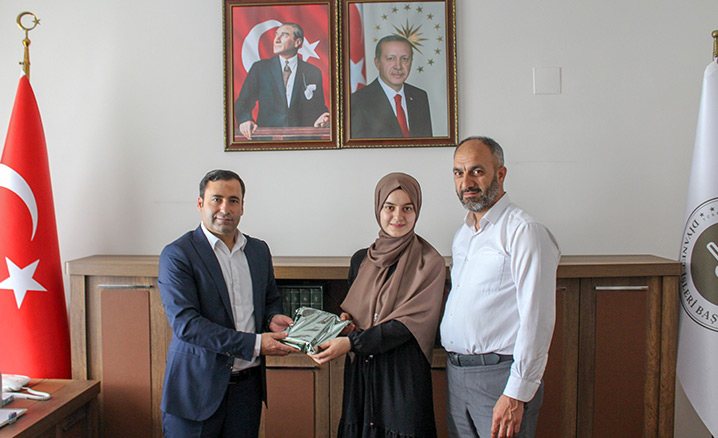 İl Müftü Vekili İshak İşçi, YKS’de dereceye giren İlyas Gümüş Kız Kur’an kursu öğrencisi Hafız Şeyma Belet’i ve ailesini müftülükte ağırlayarak hediye takdiminde bulundu.