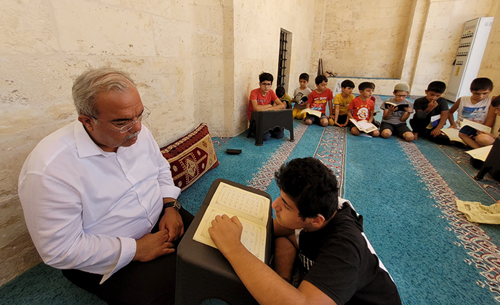 Her sabah babasının yardımı ile camiye kadar giden Ataş'ı, caminin önünde Musalla Camii Din Görevlisi Ali Canlı karşılıyor.