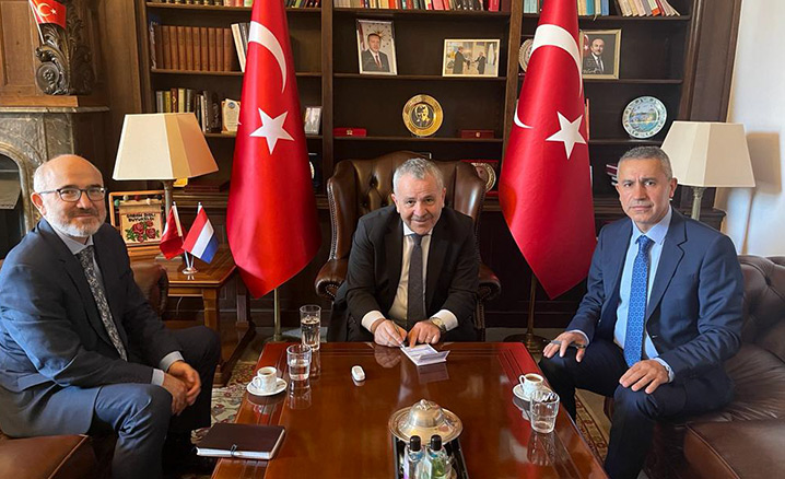 HDV Başkanı Muhlis Koç ve Yönetim Kurulu Üyesi Cengiz Korkmaz’ı kabul eden Büyükelçi Dişli, Hollanda Diyanet Vakfı tarafından yürütülen vekaletle kurban organizasyonu hakkında bilgi aldı.