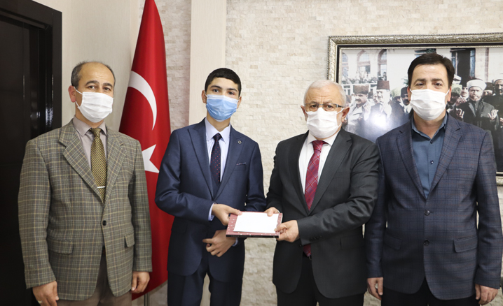 Müftü Akkuş, Kur’an-ı Kerim’i Güzel Okuma Yarışması İç Anadolu Bölge birincisi Emirhan Elmacı’ya hediye takdiminde bulundu.