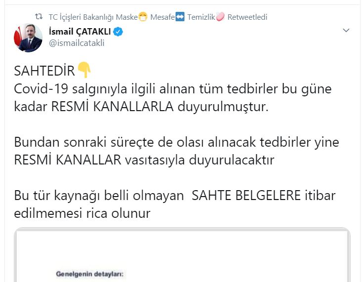 Covid-19 salgınıyla ilgili alınan tüm tedbirler bu güne kadar RESMİ KANALLARLA duyurulmuştur. Bundan sonraki süreçte de olası alınacak tedbirler yine RESMİ KANALLAR vasıtasıyla duyurulacaktır Bu tür kaynağı belli olmayan SAHTE BELGELERE itibar edilmemesi rica olunur.
