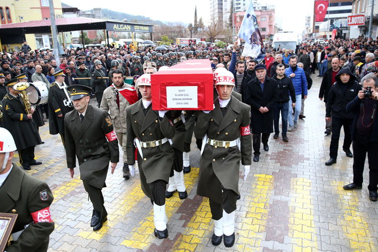 İdlib şehitlerinden Uzman Çavuş Serkan Deprem'in Türk bayrağına sarılı tabutu, Hatay'da düzenlenen törenin ardından ambulansla Düziçi ilçesi İstiklal Mahallesi'ndeki babaevine getirildi.