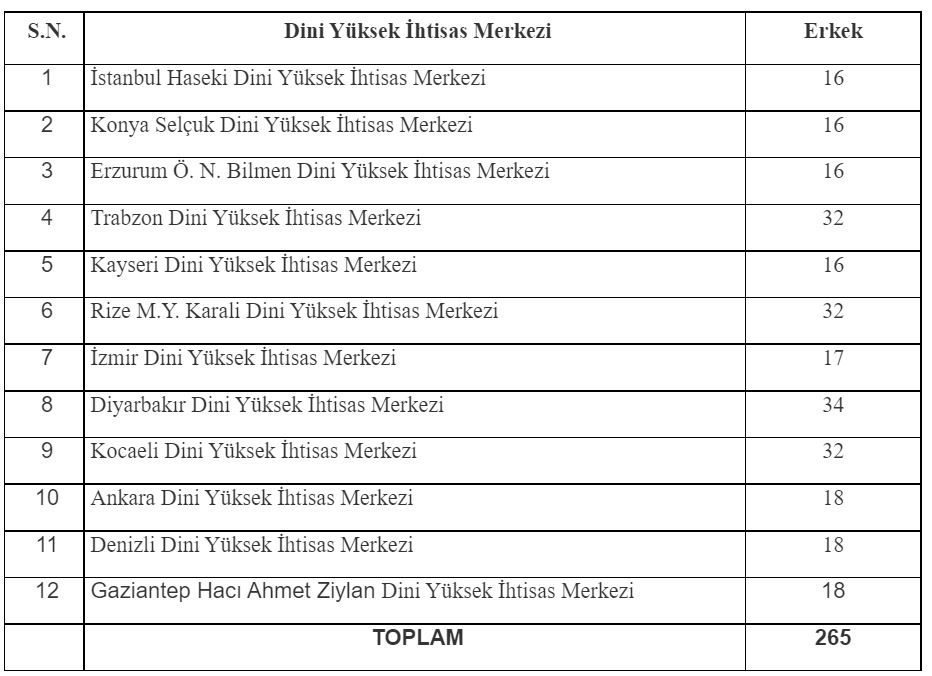 1. Dini Yüksek İhtisas Merkezlerinin erkek kursiyer kontenjanları yukarıdaki şekildedir.