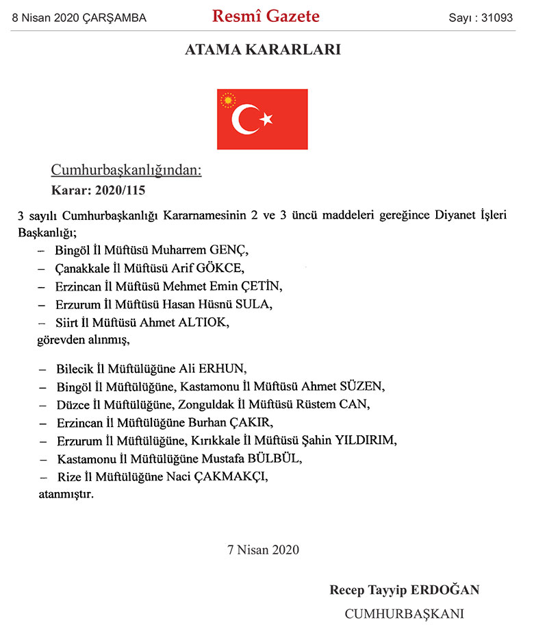İl Müftüleri Atama Kararları Resmi Gazete'nin 8 Nisan 2020, 31093 Sayısı ve 2020/115 Karar Sayısıyla Cumhurbaşkanı Recep Tayyip Erdoğan imzasıyla yayımlandı.