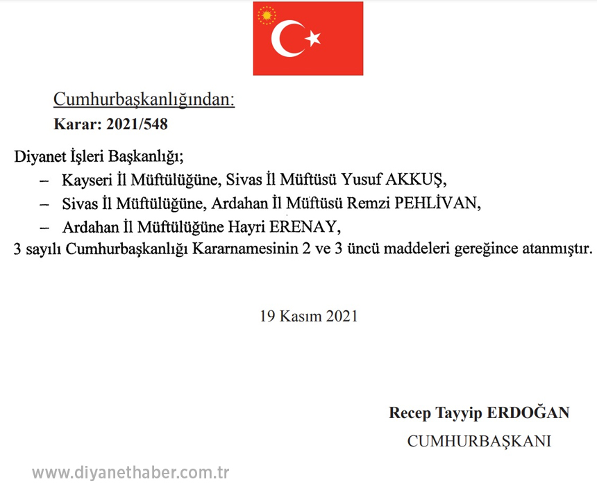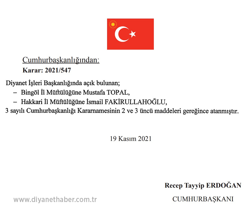 İl Müftüleri Atama Kararları, Resmi Gazete'nin 20 Kasım 2021, 31665 Sayı ve 2021/547 - 548 Karar Sayısı ve Cumhurbaşkanı Recep Tayyip Erdoğan imzasıyla yayımlandı.