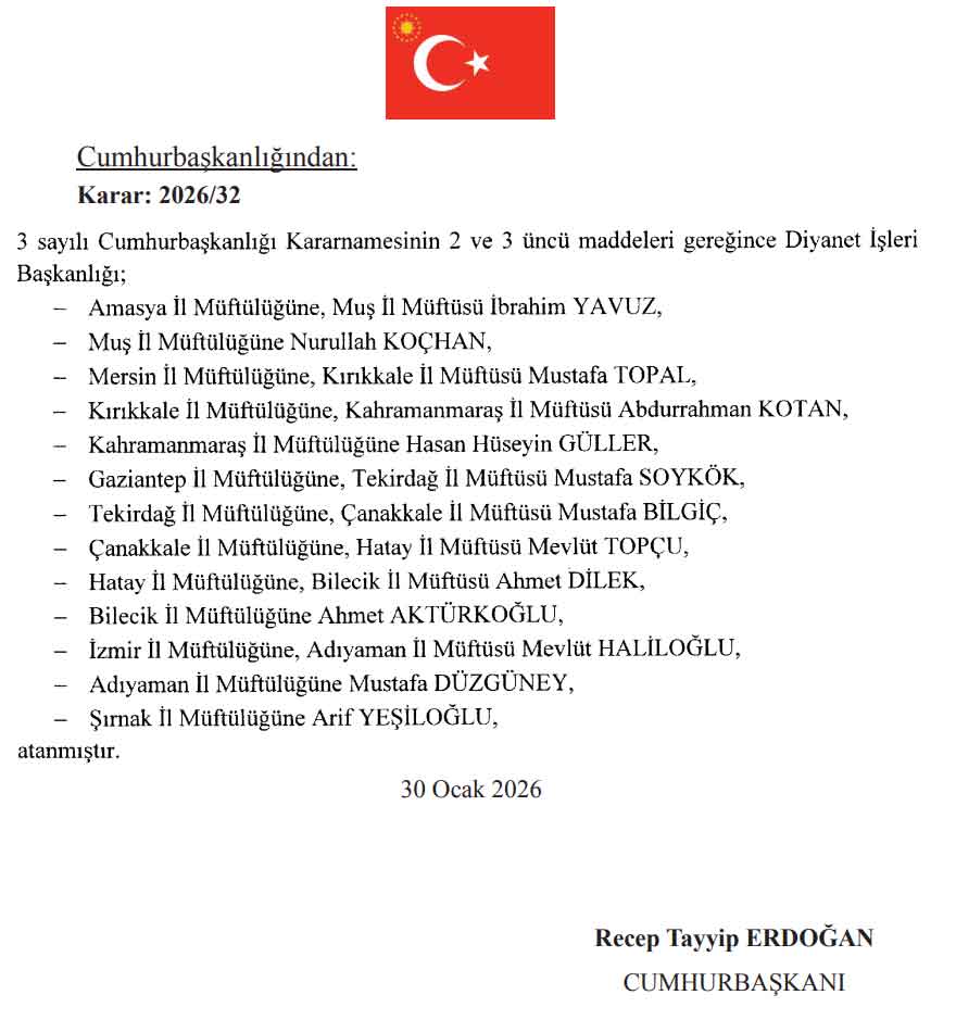Cumhurbaşkanı Recep Tayyip Erdoğan'ın imzasıyla yayımlanan kararlara göre, ataması gerçekleştirilen İl Müftüleri: