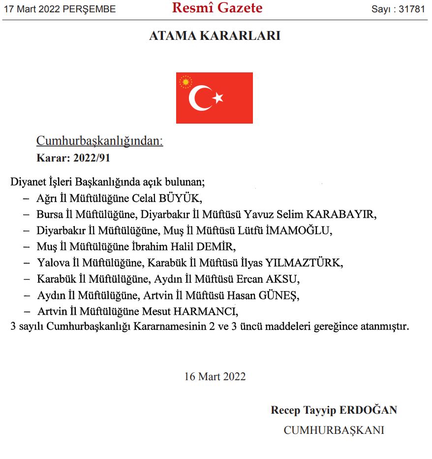 İl Müftüleri Atama Kararları, Resmi Gazete'nin 17 Mart 2022, 31781 Sayı ve 2022/91 Karar ve Cumhurbaşkanı Recep Tayyip Erdoğan imzasıyla yayımlandı.