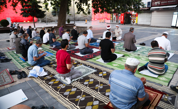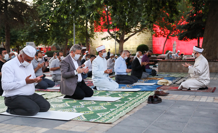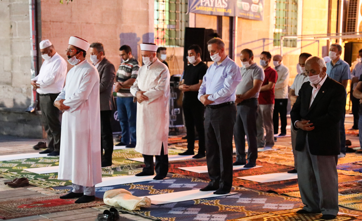 Fiziki mesafe ve maske kuralına riayet ederek cemaatle birlikte namazlarını kılan vatandaşlar, İl Müftüsü Prof. Dr. Şahin Güven tarafından 15 Temmuz şehitleri için ve Ayasofya Camii’nin yeniden ibadete açılması dolayısıyla yaptığı duaya hep birlikte âmin dedi.