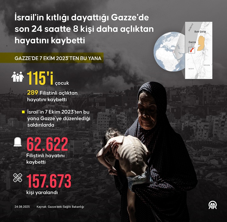 İşgalcilerin yoğun saldırıları ve ablukası altındaki Gazze Şeridi'nde açlığın can almaya devam ettiğini vurgulayan Burş, son 24 saatte 2'si çocuk 11 Filistinlinin daha açlık ve yetersiz beslenme nedeniyle yaşamını yitirdiğini belirtti.