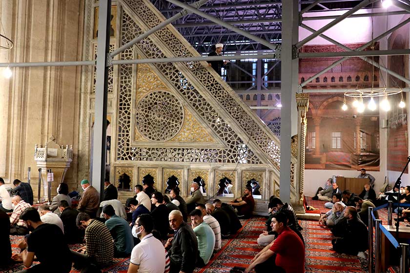 Selimiye Camii'nde restorasyon çalışmalarının sürmesi nedeniyle cemaat ibadet için oluşturulan alanda ve bahçede namazlarını kıldı.