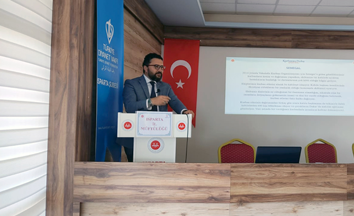 Ardından kürsüye davet edilen TDV Genel Müdür Yardımcısı Abdurrahman Çetin, “Türkiye ve dünyada düzenlenen vekaletle kurban organizasyonunda ülkemizin tüm müftülüklerinde canhıraş bir çabanın olduğunu görüyoruz. Biz de verdiğimiz sayılarla her yıl bir o kadar artırarak insanlara kurban etlerini ulaştırma çabası içerisindeyiz. Isparta’nın bu konuda ciddi bir uğraş gösterdiğinin farkındayız. Elbette bunun karşılığı ahirette Rabbimizden gelecektir inşallah.” diye konuştu.