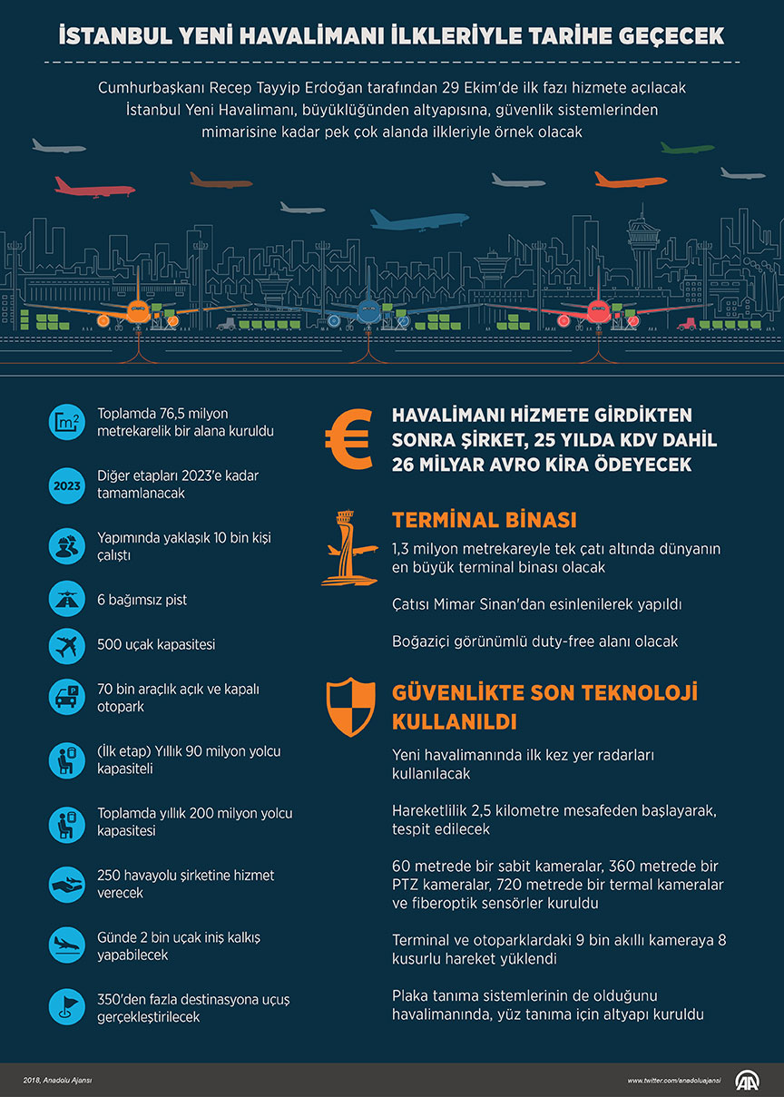 "Hatta gerekirse 200 milyona kadar çıkartılabilecektir. Yaklaşık 76,5 milyon metrekarelik bir alana inşa edilen ve ilk etapta 3 pistle açılan havalimanımız toplamda 6 pisti, paralel taksi yolları, 2 milyon metrekareyi bulacak kapalı alanı, 6,5 milyon metrekare apron büyüklüğü, terminalleri arasındaki ulaşımı sağlayacak raylı sistemi, kargo ve genel havacılık terminalleri, kapasiteyi karşılayacak büyüklükteki kapalı ve açık otoparkları, destek birimleri, sosyal tesisleri, diğer tüm üniteleri ile gerçekten dev bir eserdir."
