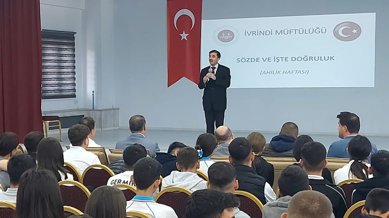 İvrindi İlçe Müftülüğü tarafından "Ahilik Haftası" etkinlikleri kapsamında ÇEDES programı çerçevesinde öğrencilere yönelik "Sözde ve İşte Doğruluk" konulu konferanslar verildi.