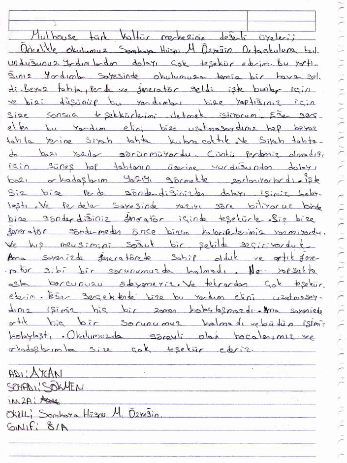 Fransa'da kendilerini düşünen Cct Mulhouse Kadın Kolları'na bir mektup yazan Somkaya Hüsnü M. Özyeğin İlköğretim Okulu öğrencileri sevinçlerini dile getirdi.