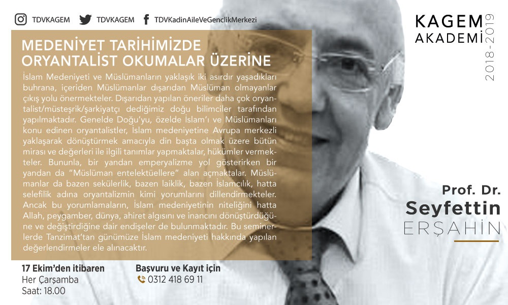 Prof. Dr. Seyfettin Erşahin yönetiminde gerçekleştireceğimiz bu çalışma grubunda, İslam Medeniyeti ve Müslümanların yaklaşık iki asırdır yaşadıkları buhrana, içeriden Müslümanlar dışarıdan Müslüman olmayanlar çıkış yolu önermekteler. Dışarıdan yapılan öneriler daha çok oryantalist/müsteşrik/şarkiyatçı dediğimiz doğu bilimciler tarafından yapılmaktadır. Genelde Doğu’yu, özelde İslam’ı ve Müslümanları konu edinen oryantalistler, İslam medeniyetine Avrupa merkezli yaklaşarak dönüştürmek amacıyla din başta olmak üzere bütün mirası ve değerleri ile ilgili tanımlar yapmaktalar, hükümler vermekteler. Bununla, bir yandan emperyalizme yol gösterirken bir yandan da “Müslüman entelektüellere” alan açmaktalar. Müslümanlar da bazen sekülerlik, bazen laiklik, bazen İslamcılık, hatta selefilik adına oryantalizmin kimi yorumlarını dillendirmekteler. Ancak bu yorumlamaların, İslam medeniyetinin niteliğini hatta Allah, peygamber, dünya, ahiret algısını ve inancını dönüştürdüğüne ve değiştirdiğine dair endişeler de bulunmaktadır. Bu seminerlerde Tanzimat’tan günümüze İslam medeniyeti hakkında yapılan değerlendirmeler ele alınacaktır.