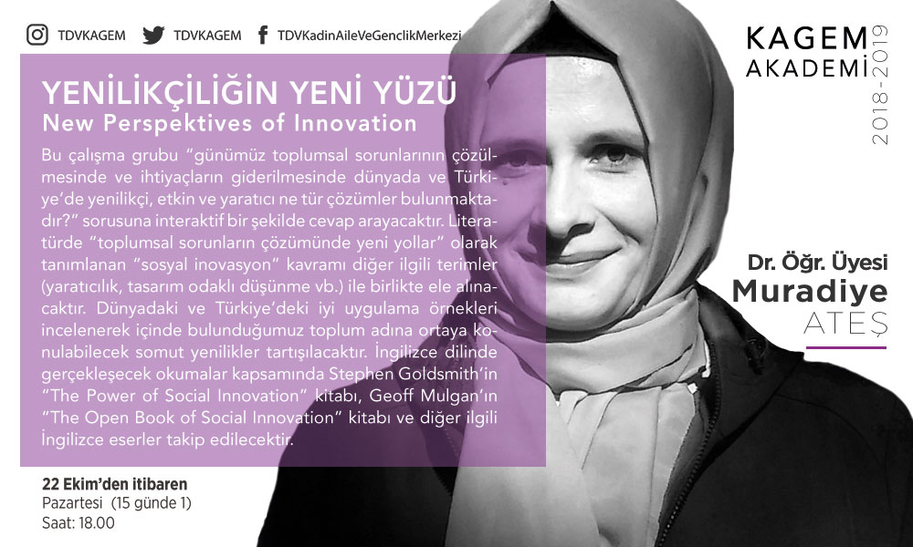 Dr. Muradiye Ateş ile gerçekleştirilecek İngilizce Metin Okumaları grubu; “günümüz toplumsal sorunlarının çözülmesinde ve ihtiyaçların giderilmesinde dünyada ve Türkiye’de yenilikçi, etkin ve yaratıcı ne tür çözümler bulunmaktadır?” sorusuna interaktif bir şekilde cevap arayacaktır. Literatürde “toplumsal sorunların çözümünde yeni yollar” olarak tanımlanan “sosyal inovasyon” kavramı diğer ilgili terimler (yaratıcılık, tasarım odaklı düşünme vb.) ile birlikte ele alınacaktır. Dünyadaki ve Türkiye’deki iyi uygulama örnekleri incelenerek içinde bulunduğumuz toplum adına ortaya konulabilecek somut yenilikler tartışılacaktır. İngilizce dilinde gerçekleşecek okumalar kapsamında Stephen Goldsmith’in “The Power of Social Innovation” kitabı, Geoff Mulgan’ın “The Open Book of Social Innovation” kitabı ve diğer ilgili İngilizce eserler takip edilecektir.