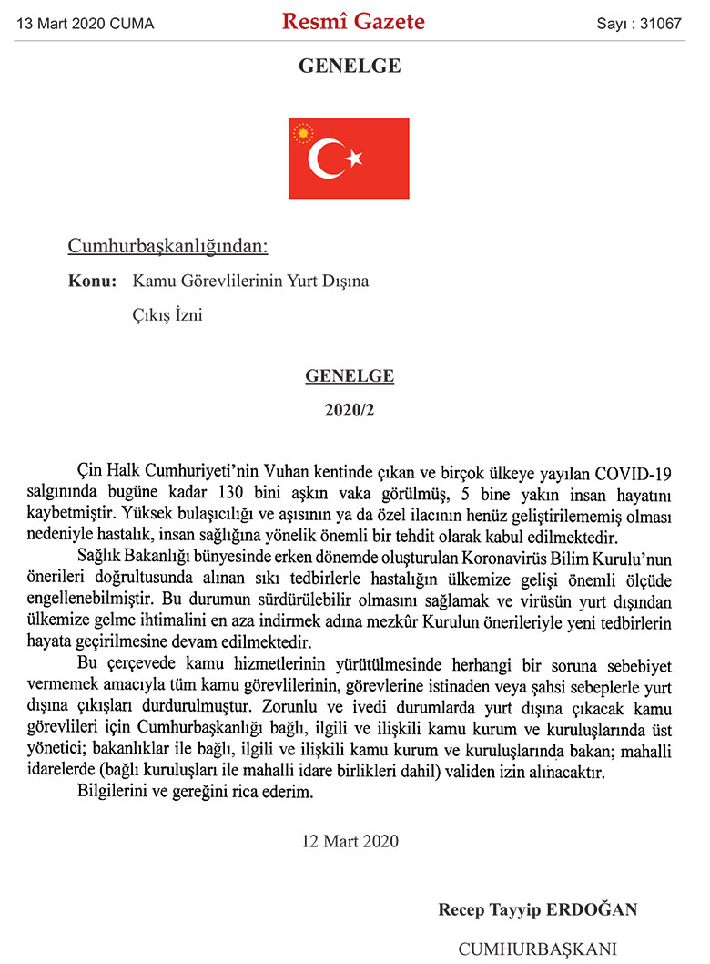 Türkiye Cumhurbaşkanı Recep Tayyip Erdoğan imzasıyla Resmi Gazete'de yayımlanan genelgede, Çin Halk Cumhuriyeti'nin Vuhan kentinde çıkan ve birçok ülkeye yayılan Kovid-19 salgınında bugüne kadar 130 bini aşkın vaka görüldüğü ve 5 bine yakın insanın hayatını kaybettiği belirtildi.