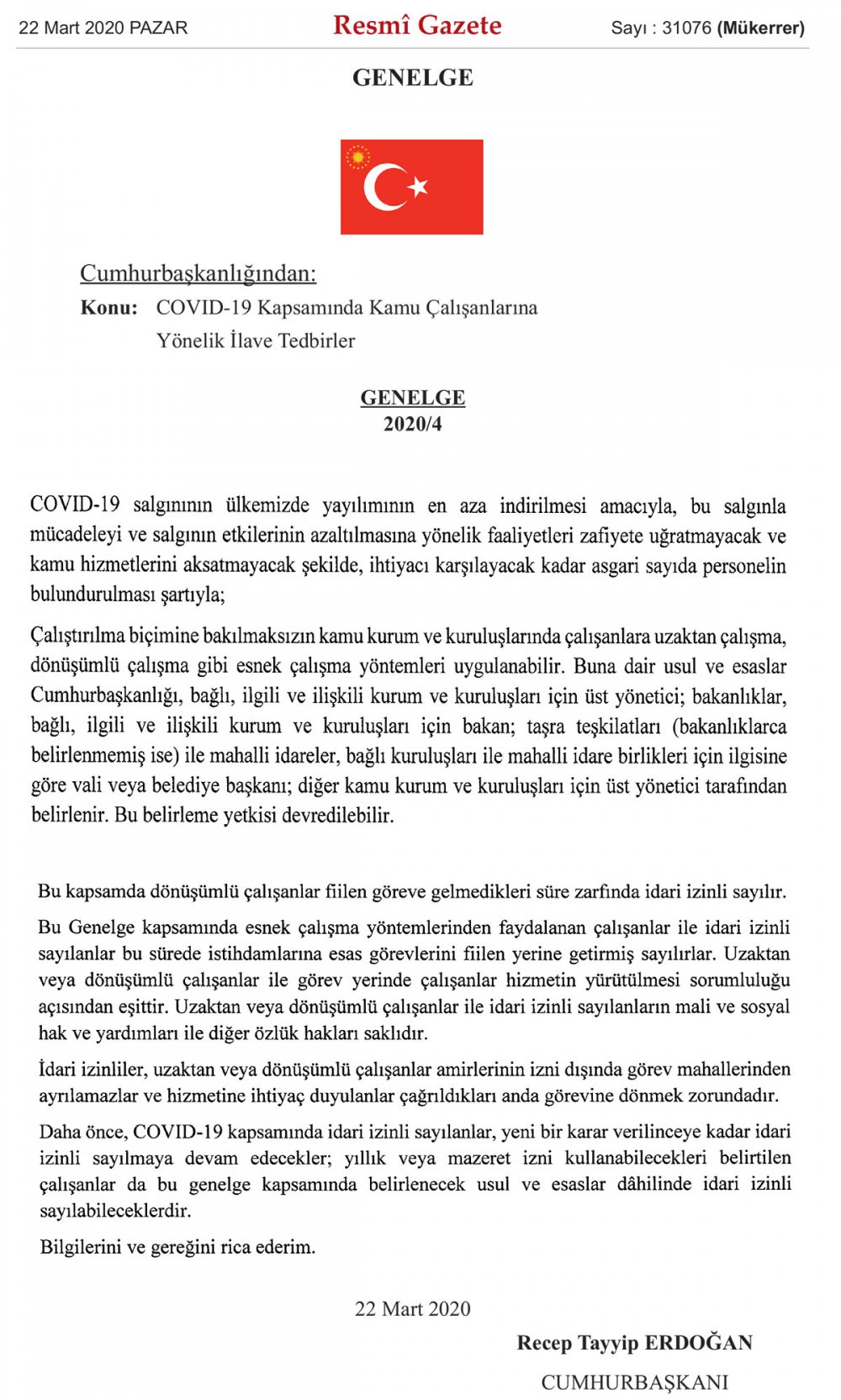 Türkiye Cumhurbaşkanı Recep Tayyip Erdoğan imzasıyla "Koronavirüsle Mücadele Kapsamında Kamu Çalışanlarına Yönelik İlave Tedbirler" konulu genelge Resmi Gazete'nin mükerrer sayısında yayımlandı.