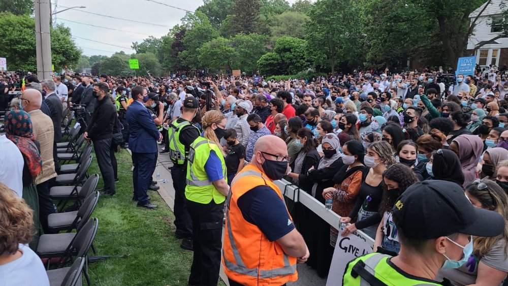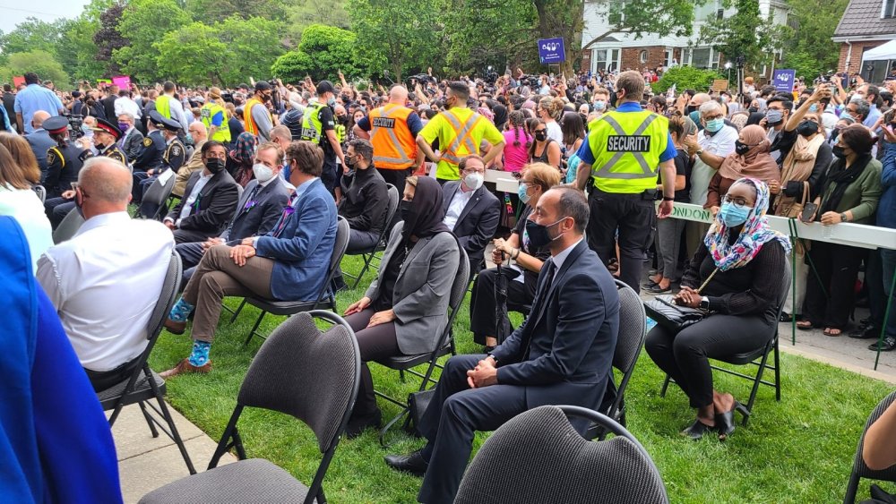 Kur'an-ı Kerim tilaveti ile başlayan törende konuşan Başbakan Trudeau, olayın bir terör saldırısı olduğunu yineleyerek, "Üç neslin bir arada olduğu bir aile, hak etmedikleri bir şekilde hayata veda ettiler. Tüm Kanada ile yanınızdayız. Bu ülkede İslamofobi gerçektir, ayrımcılık gerçektir. Tüm bunlara ve teröre karşı hep birlikte hayır demeliyiz." diye konuştu.