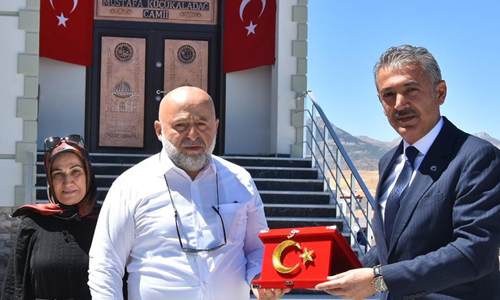 Açılış töreninin ardından cami yapımında emeği geçen hayırsever Mustafa-Perihan Küçükaladağ çiftine plaket takdim edildi.