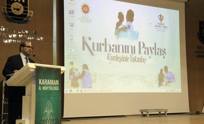 Bu kapsamda Karaman İl Müftülüğü ile Türkiye Diyanet Vakfı Karaman Şubesi ev sahipliğinde "2022 Yılı Vekalet Yoluyla Kurban Kesim Organizasyonu Tanıtım ve İstişare Toplantısı" düzenlendi.