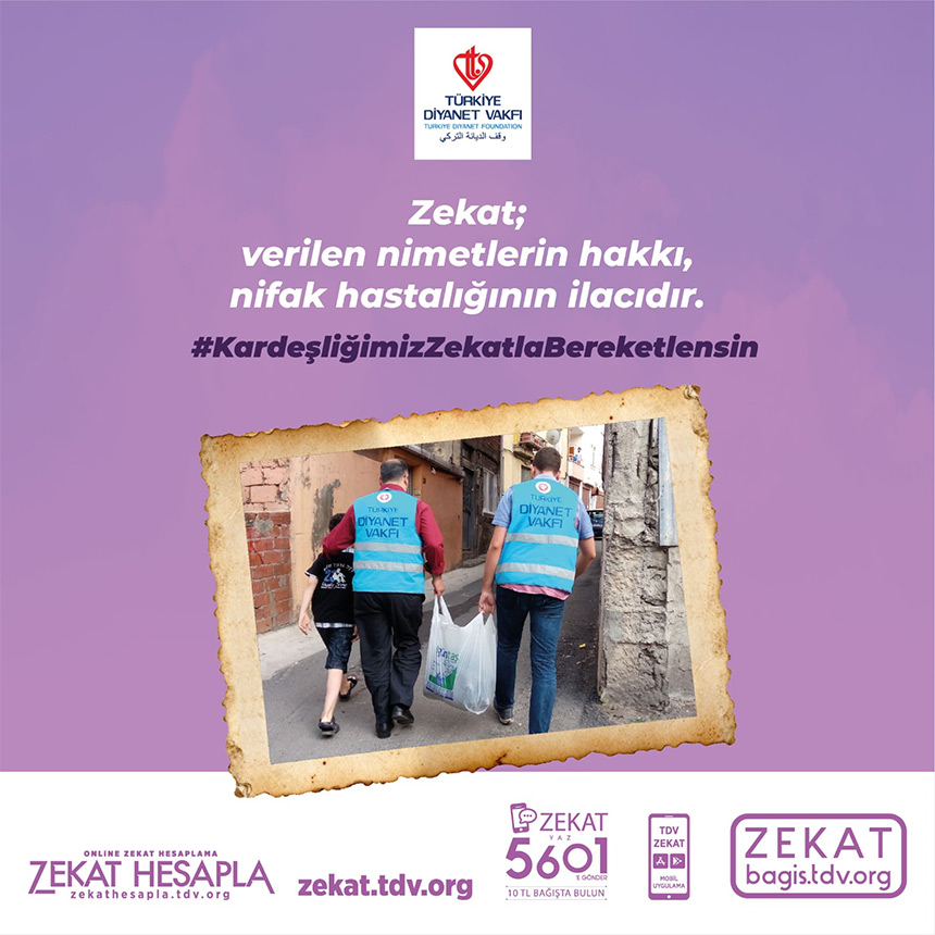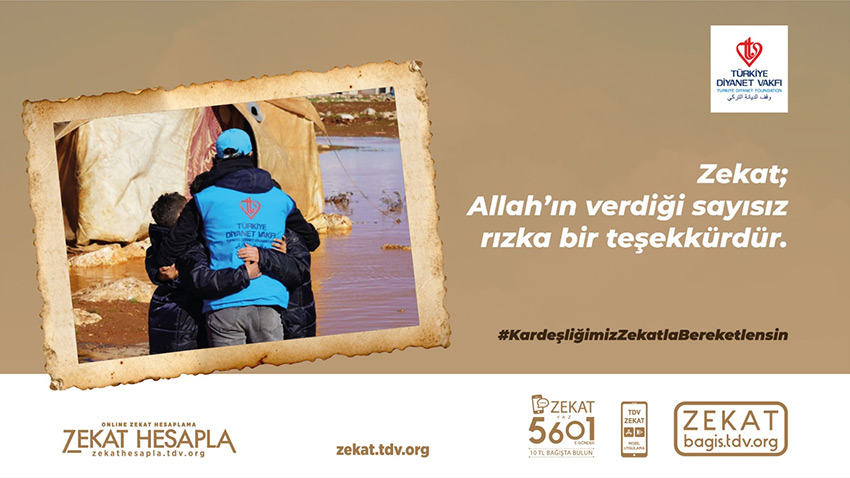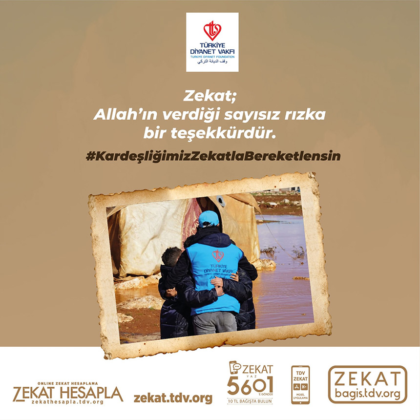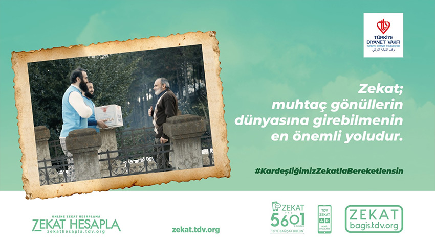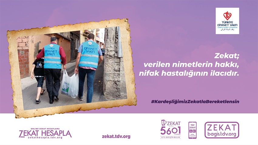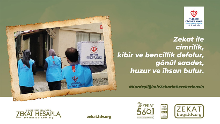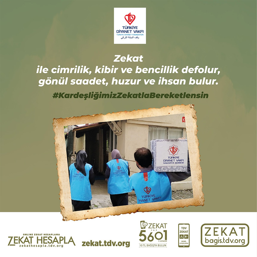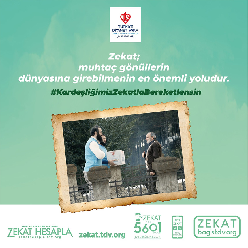 ZEKAT yazıp 5601’e SMS göndererek 10 TL zekat verebilir veya bagis.tdv.org adresini ziyaret edebilirsiniz.