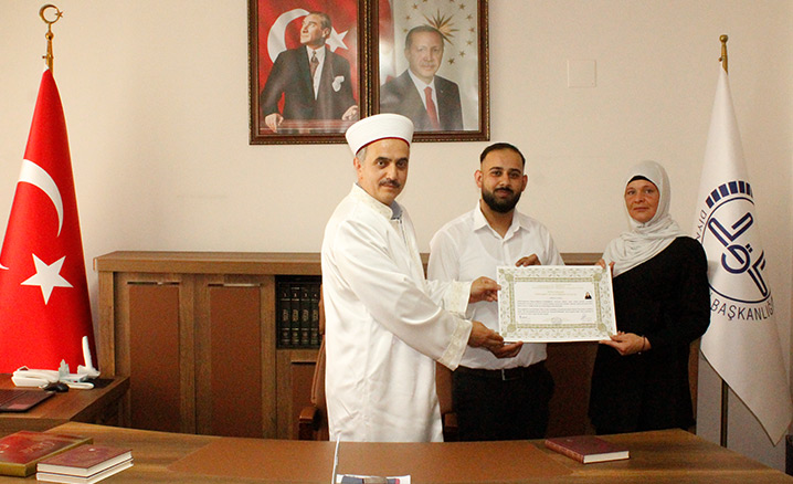 İl Müftüsü Bayram, Yüsra’yı tebrik ederek İhtida Belgesi ile Kur'an-ı Kerim hediye etti.