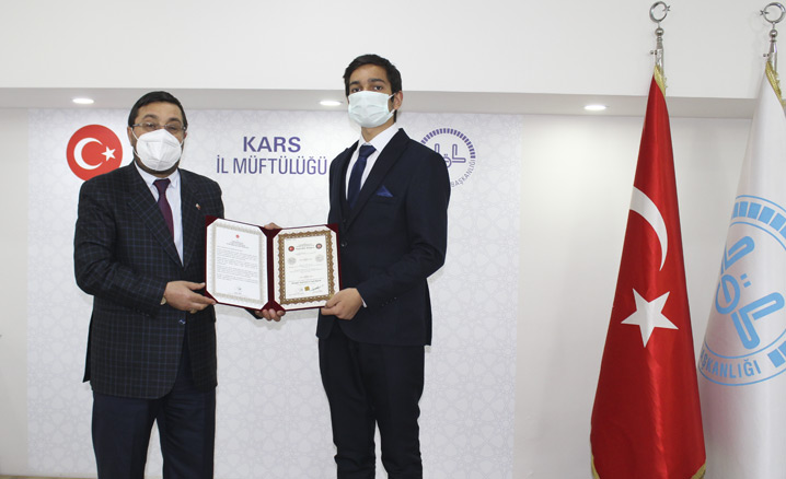 Kars İl Müftülüğüne bağlı Kur'an kurslarında hafızlık eğitimini tamamlayan 7 öğrenci, hafızlık belgelerini İl Müftüsü Yusuf Eviş'in elinden aldı.