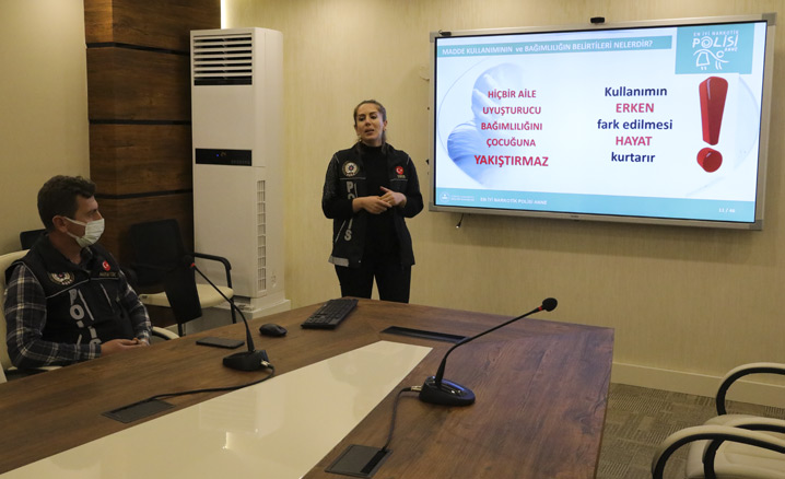 Katılımcılar, bağımlılıkla mücadele konusunda sunumlar eşliğinde bilgilendirildi.