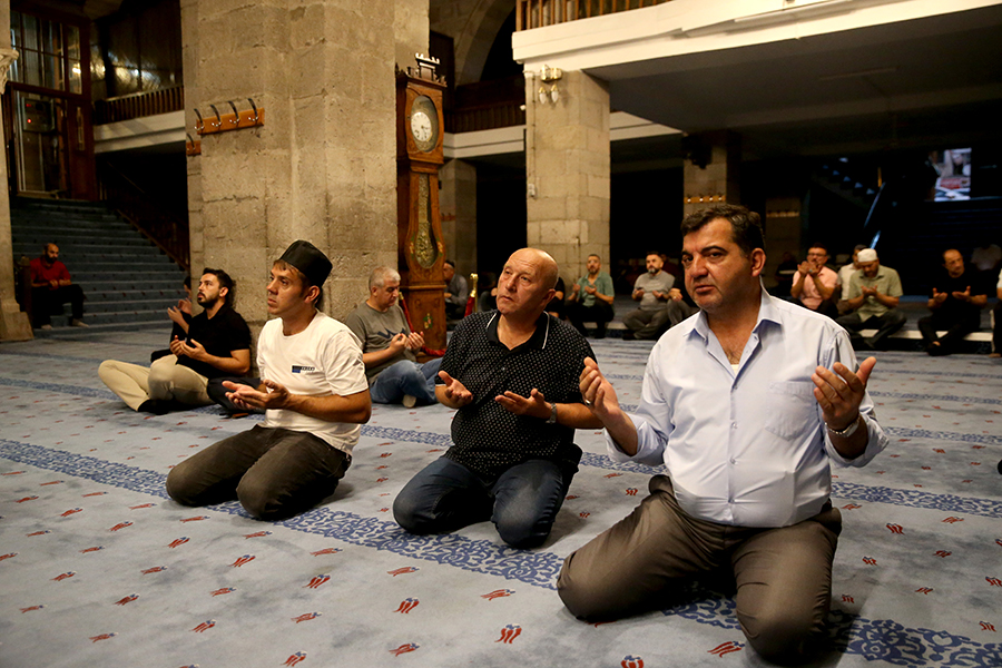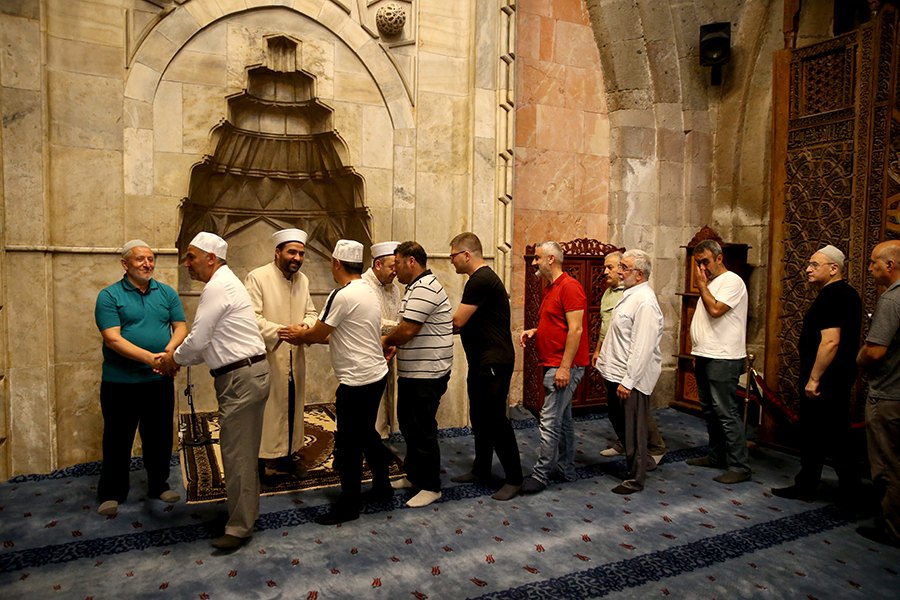 Tarihi Cami Kebir'e gelen gurbetçiler, sabah namazını kılıp, dua ettikten sonra Kur'an-ı Kerim tilaveti dinledi.