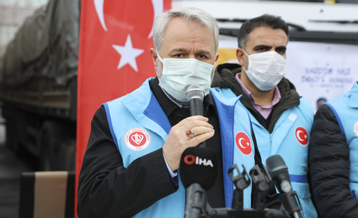 Koronavirüs tedbirlerine riayet edilerek gerçekleştirilen törende, konuşmaların ardından yardım tırları dualarla Suriye’ye uğurlandı.