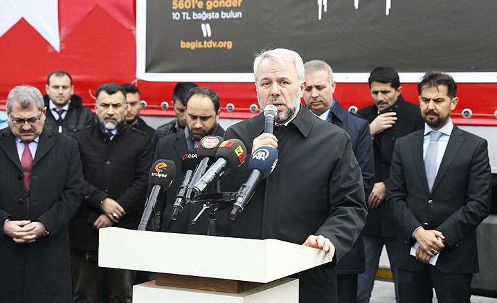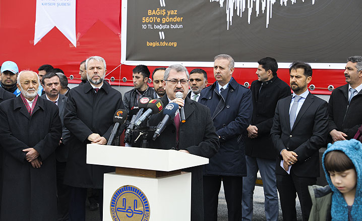 “Bizler ülke insanı olarak acıların, sıkıntıların ve problemlerin olduğu dönemlerde her türlü ihtilafı bir kenara bırakır, bir araya gelir ve birlikte hareket ederiz. Devletimizin bütün kurumları, sivil toplum kuruluşlarımız ve vatandaşlar olarak yapılması gerekenlerin üzerinde bir fedakârlıkla bölgeye intikal edip vefat edenlerin sayısının artmayacağı şekilde hizmetler ve kurtarma faaliyetleri yapıldı. Orada göçüğün altında kaldıkları zaman zamanını Kur’an-ı Kerim okuyarak, namaz kılarak geçiren vatandaşlarımızdan, diğer tarafta kendisini kurtaranlara; ‘Geride evlatlarım var. Onları da kurtarın.’ diyerek yalvaran annelerden, hatta dilini bile bilmediği komşusunun kurtarılması için gayret gösteren hanımefendiden hepimiz haberdarız. Ayrıca yine bir ailenin kurtuluşuna vesile olan Suriyeli üniversite öğrencisi Mahmut’tan da haberimiz var. İşte bizler de Kayseri İl Müftülüğü ve Türkiye Diyanet Vakfı Kayseri Şubesi olarak depremzede kardeşlerimizin yaralarını sarmak için hemen harekete geçtik ve üç tır yardımı sizlerin de katılımıyla bölgeye gönderiyoruz. Yüce Mevla hayırseverlerimizden razı olsun.”
