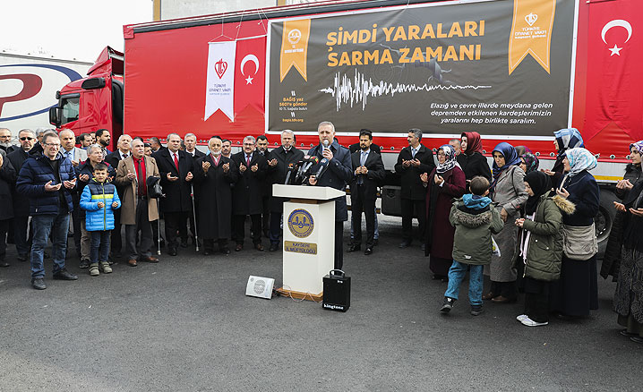 Konuşmaların ardından Melikgazi İlçe Müftüsü Ahat Taşcı’nın yaptığı dua ile ihtiyaç malzemelerini taşıyan 3 tır deprem bölgesine uğurlandı.