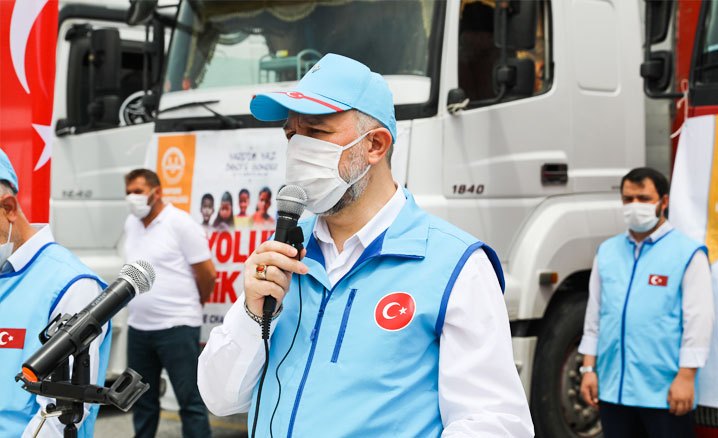 Bundan önceki tırlarımızın sayısı 615 idi. Bu tırlarla birlikte 4 yıldır gönderdiğimiz yardım tırlarımızın sayısı 626’ya çıkmış oluyor. Kayserili hayırseverlerimize bu katkılarından dolayı teşekkür ediyorum. Koronavirüs günlerinde ülkemizin bütün dünyada olduğu gibi koronavirüs ile mücadele etmiş olduğu, fabrikalarımızın çalışmalarını yarıya belki de üçte birine indirdikleri bir zaman diliminde dahi Kayserili hayırseverlerimiz, sınırımızın hemen yanı başındaki komşularımızın ihtiyaçların gidermek için bizlere böylesine yardımları ulaştırıyorlar. Bizler de bölge insanımızın ihtiyaçlarını gidermek için bu yardımları yola çıkarıyoruz. Ramazan ayı münasebetiyle İl ve ilçelerimizde bizler yardım faaliyetlerimizi devam ettiriyoruz. İhtiyaç sahiplerinin ihtiyaçlarını gideriyoruz. Binlerce yetimin, öksüzün bayramlıklarını alıyoruz. Aynı zamanda evlerinde ihtiyacı olduğunu düşündüğümüz özellikle de gıda kolilerini hazırlayıp kendilerine takdim ediyoruz ve etmeye devam edeceğiz.’’