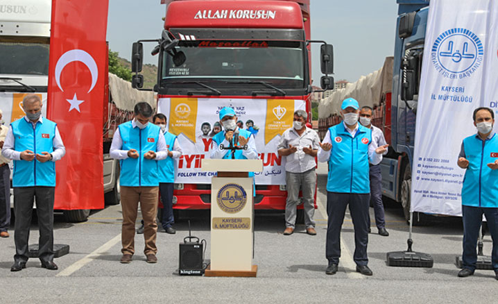 Diyanet İşleri Başkanlığı ile Türkiye Diyanet Vakfı iş birliğinde sürdürülen; “Yolumuz İyilik Olsun” kampanyası kapsamında, Kayseri Müftülüğü koordinesinde “Yükümüz Kardeşlik” sloganıyla ve hayırseverlerin desteğiyle hazırlanan insani yardım malzemelerinin bulunduğu 11 tır, düzenlenen törenle Suriye’ ye uğurlandı.