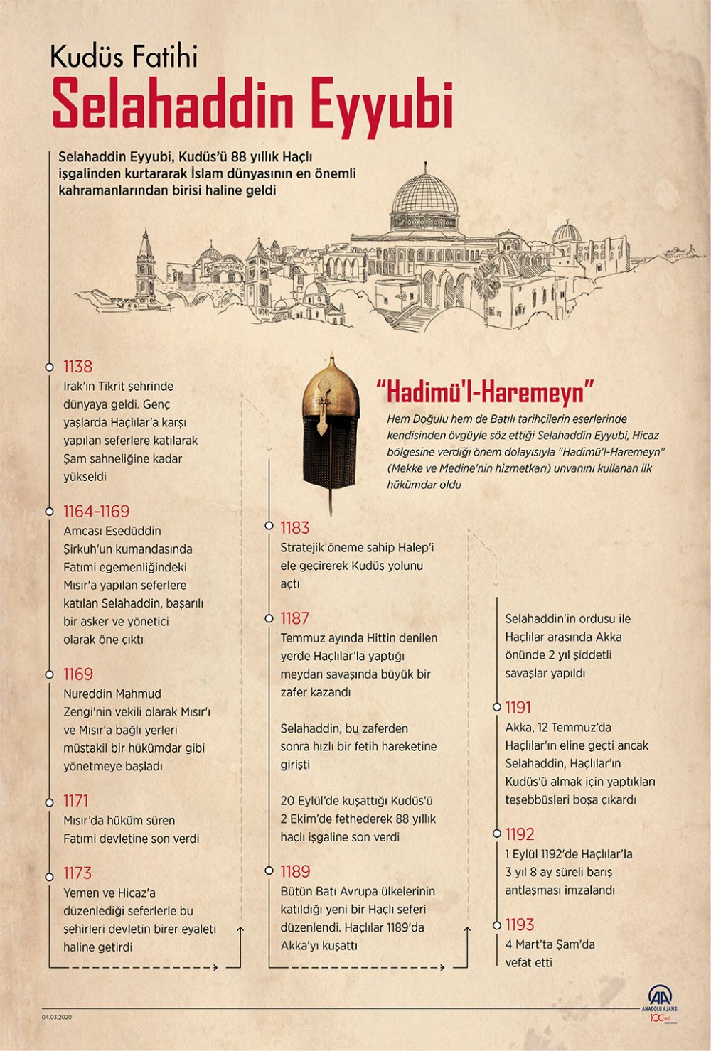 AA muhabirinin çeşitli kaynaklardan derlediği bilgilere göre, Haçlı işgali altındaki şehri işgalden kurtaracak komutan, 1138'de Irak'ın Tikrit şehrinde dünyaya geldi. Selahaddin Eyyubi’nin babası Zengi hanedanlığında Tikrit, Ba'lebek ve Şam valilikleri yapmış Necmeddin Eyyub'tur.
